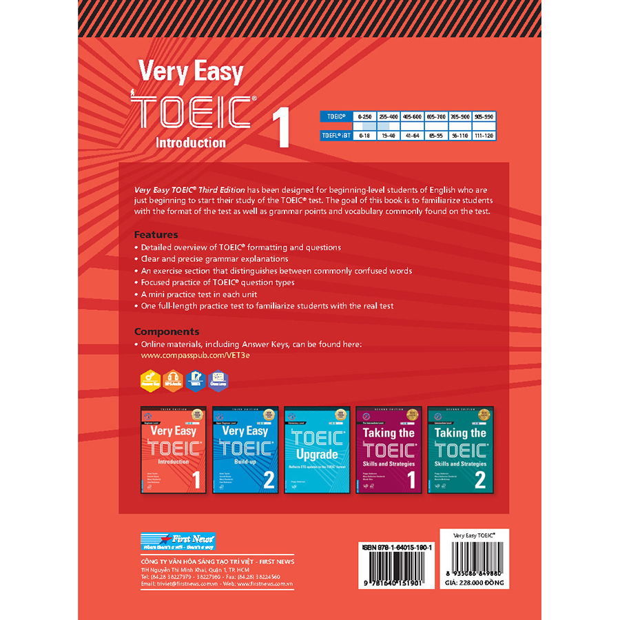 BỘ SÁCH NEW TOEIC – Very Easy TOEIC 1,2 Bộ sách New Toeic gồm 5 cuốn Very Easy TOEIC 1, Very Easy TOEIC 2, TOEIC Upgrade, Taking the TOEIC 1, Taking the TOEIC 2 giới thiệu đến độc giả những kỹ năng cần thiết cho kỳ thi NEW TOEIC. Mỗi cuốn sách được chia theo trình độ Sơ cấp/ Trung Cấp/ Cao cấp (từ A1 đến C1+) để giúp các sinh viên dần làm quen với các phần thi của kỳ thi NEW TOEIC, cũng như các dạng câu hỏi thường gặp. Very Easy TOEIC 1 phù hợp với người học muốn đạt trình độ A1-A2 (250 – 400 điểm). Very Easy TOEIC 2 phù hợp với người học muốn đạt trình độ A2 (400-600 điểm). TOIEC Upgrade phù hợp với người học muốn đạt trình độ A2 trình độ A2-B1 (600-780 điểm). Taking the TOEIC 1 phù hợp với người học muốn người học muốn đạt trình độ B1-B2 (780 – 900 điểm). Taking the TOEIC 2 phù hợp với người học muốn người học muốn đạt trình độ B2-C1+ (900 – 990 điểm). Điểm nổi bật ở bộ sách NEW TOEIC: • Ví dụ và phần giải thích cụ thể cho từng dạng câu hỏi. • Các bài tập được thiết kế theo thứ tự câu hỏi trong bài thi, và theo các điểm ngữ pháp thường gặp). • Các lời khuyên và mẹo thực tế giúp thí sinh làm bài thi nhanh hơn, hiệu quả hơn. • Danh sách các từ vựng thiết yếu thường gặp trong bài thi. • Các điểm ngữ pháp thường gặp ở mỗi phần được giải thích rõ ràng kèm theo các ví dụ cụ thể. • Bài thi thử cho mỗi phần thi theo đúng format chuẩn • Kèm chương trình Classloop: Tài liệu học trực tuyến để đánh giá năng lực làm bài thi. Tác giả: Anne Taylor, Garrett Byrne, Mary Chadwick, Sam Robinson