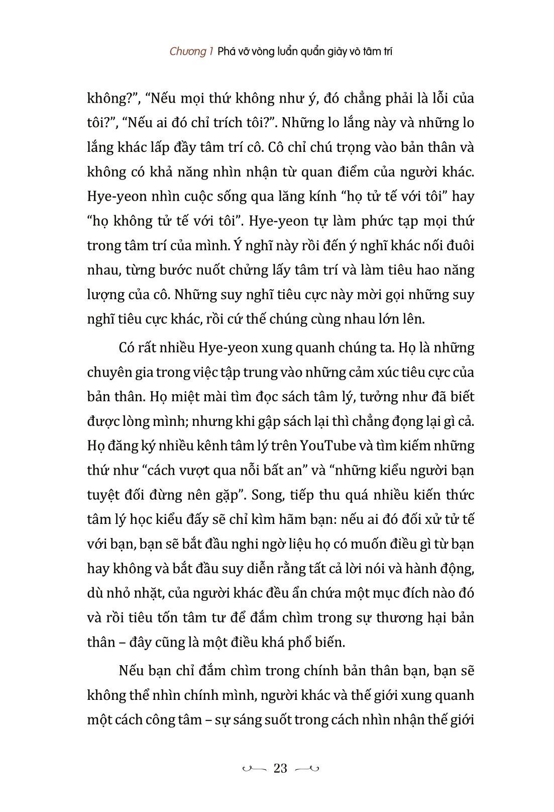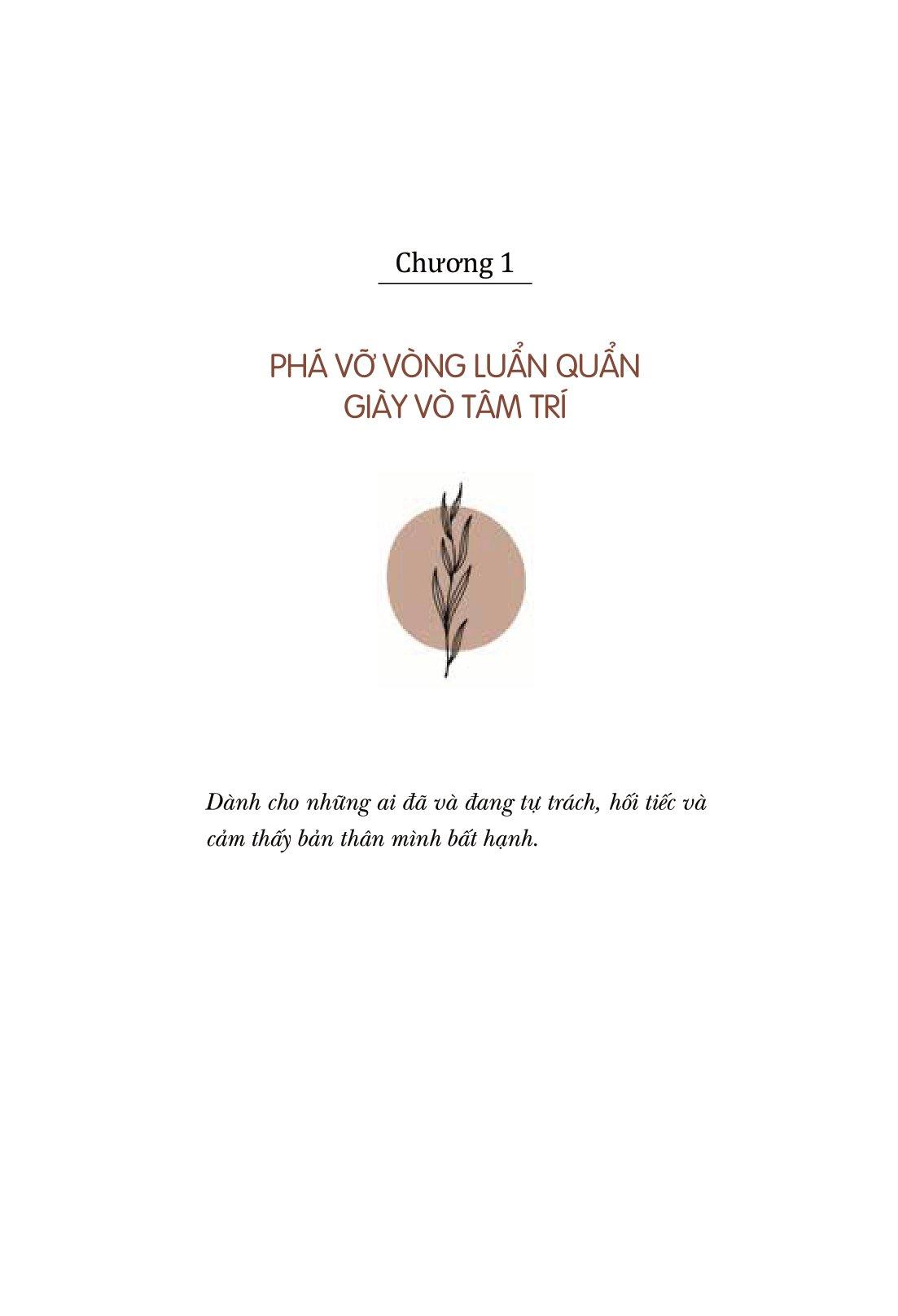 Chương 1 sẽ đề cập đến cách phá vỡ chuỗi suy nghĩ đang ám ảnh bạn, đồng thời giới thiệu một góc nhìn mới để bạn có thể ngừng suy nghĩ quá nhiều về bản thân, từ bỏ thói quen sống mãi trong những tổn thương quá khứ và không còn lo lắng quá nhiều về tương lai chưa đến.
