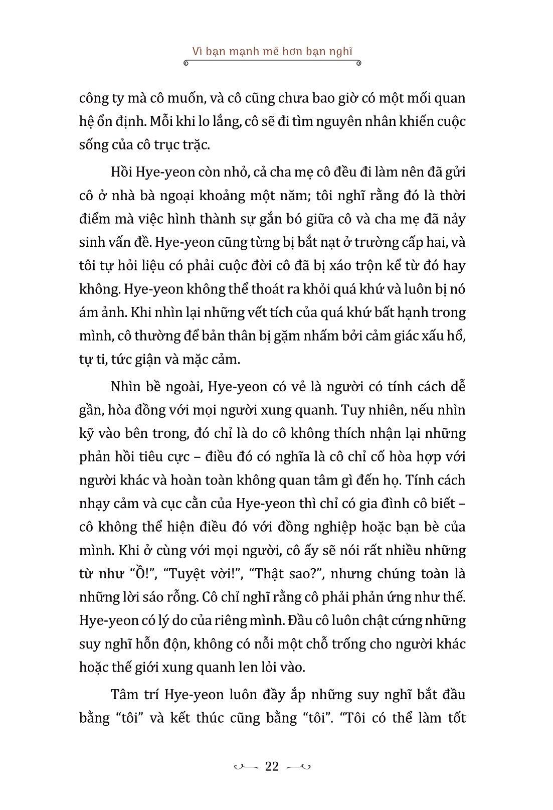 Con người chúng ta được bao quanh bởi những mối quan hệ xã hội và các mối quan hệ này cũng chính là một trong những mối bận tâm lớn nhất trong cuộc sống của chúng ta. Thực tế là, mối quan hệ cũng là một yếu tố có thể thay đổi và điều chỉnh. Người có thể phá vỡ được khuôn mẫu của cuộc sống là người kiểm soát được tình huống xung quanh, bắt tay vào hành động và thay đổi, chứ không phải đào sâu vào nỗi lo lắng, buồn bã và sự nhạy cảm của chính m.ình. Cuốn sách “Vì Bạn Mạnh Mẽ Hơn Bạn Nghĩ” sẽ giúp bạn đọc khám phá những sức mạnh tiềm tàng và làm chủ năng lực tâm lý tiềm ẩn của bản thân.