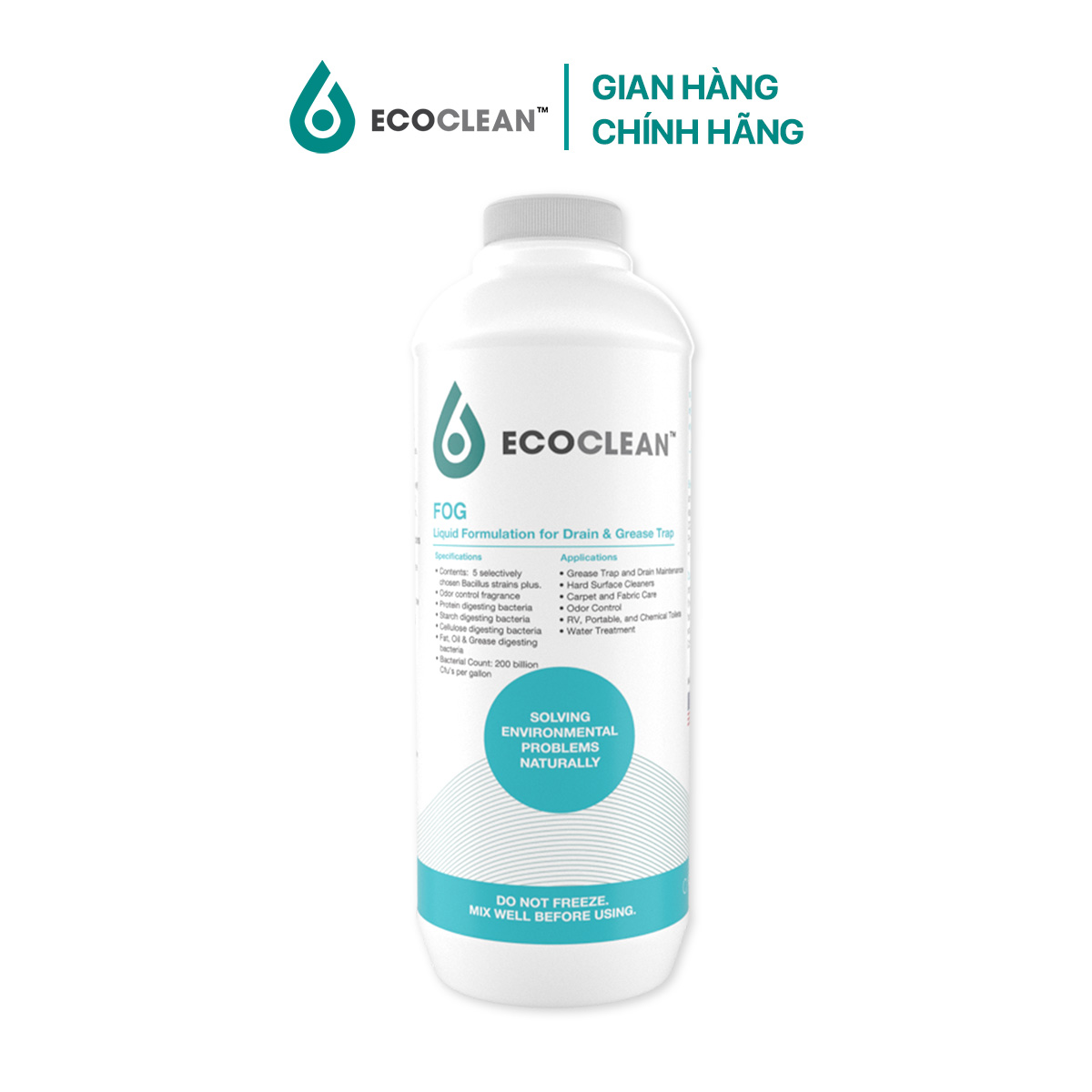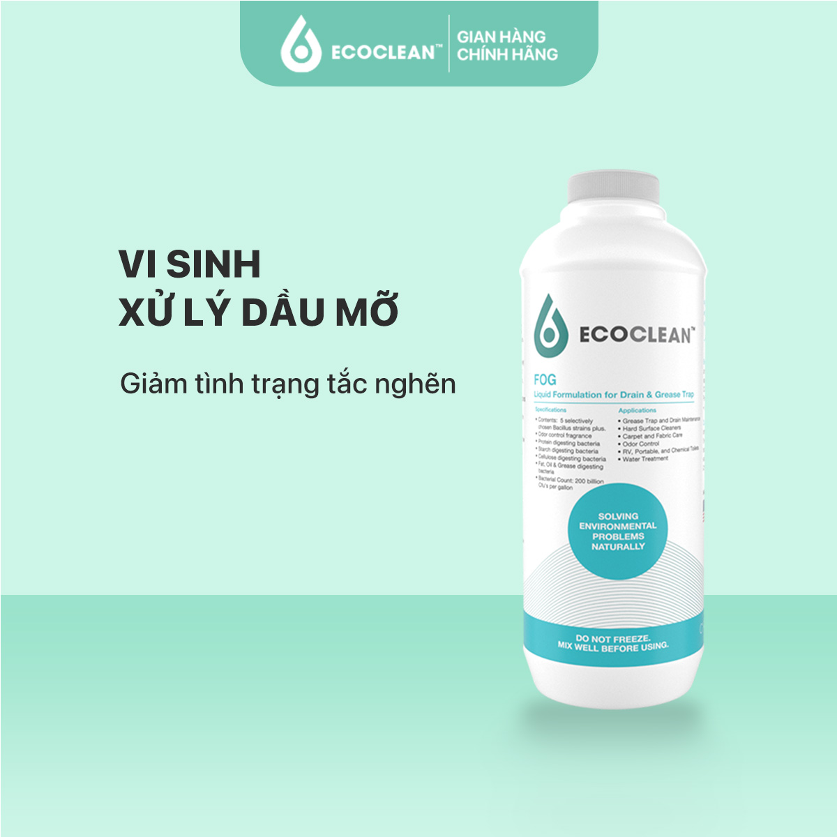 - EcoClean FOG là sản phẩm vi sinh xử lý dầu mỡ được phối trộn nhiều chủng vi sinh mật độ cao, phân lập chuyên biệt dùng cho xử lý đường ống thoát nước bị tắc nghẽn, giúp thông cống. Vi khuẩn có lợi trong sản phẩm hoạt động mạnh mẽ nhờ các chất xúc tác enzymo giúp tăng tốc độ xử lý.