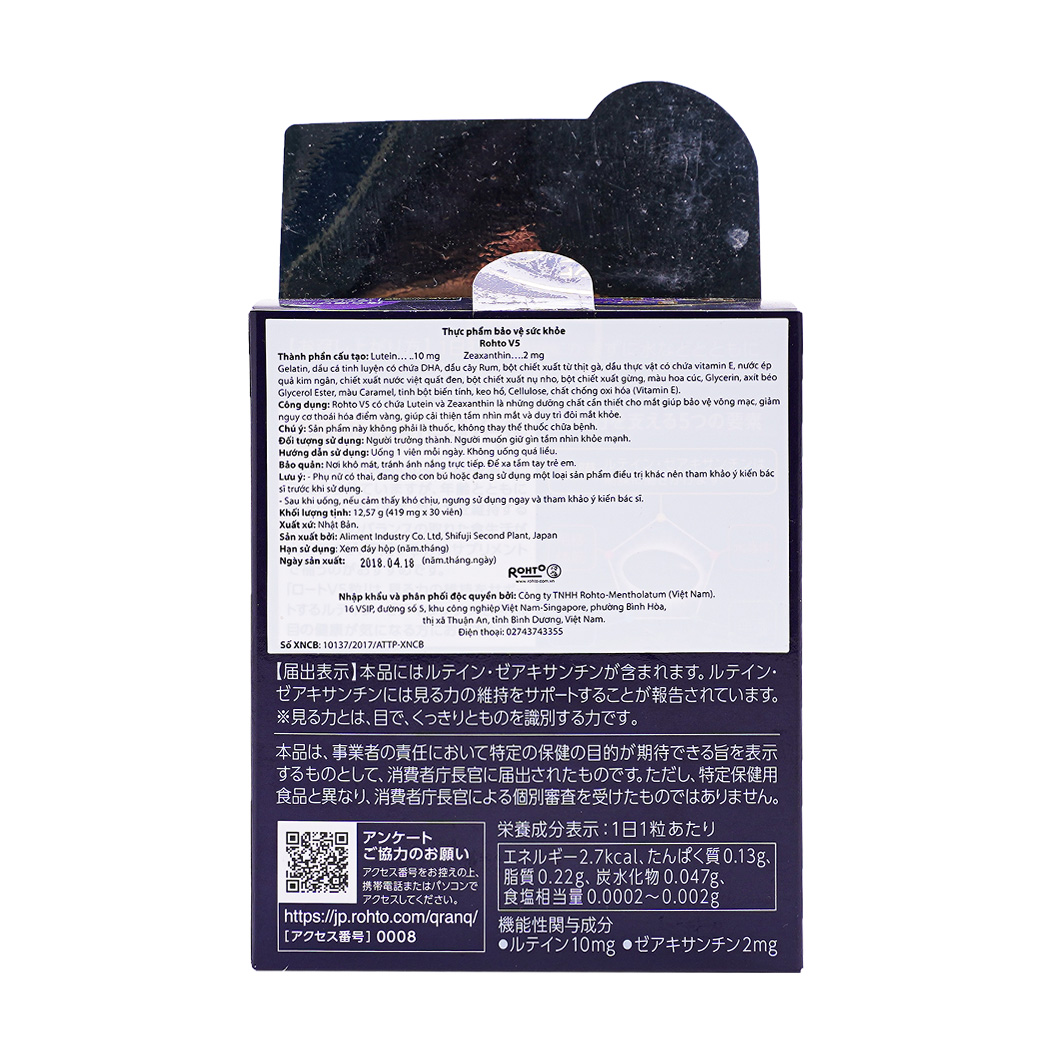 Rohto V5 có chứa Lutein và Zeaxanthin là những dưỡng chất cần thiết cho mắt giúp bảo vệ võng mạc, hỗ trợ giảm nguy cơ thoái hóa điểm vàng, giúp cải thiện tầm nhìn mắt và duy trì đôi mắt khỏe.