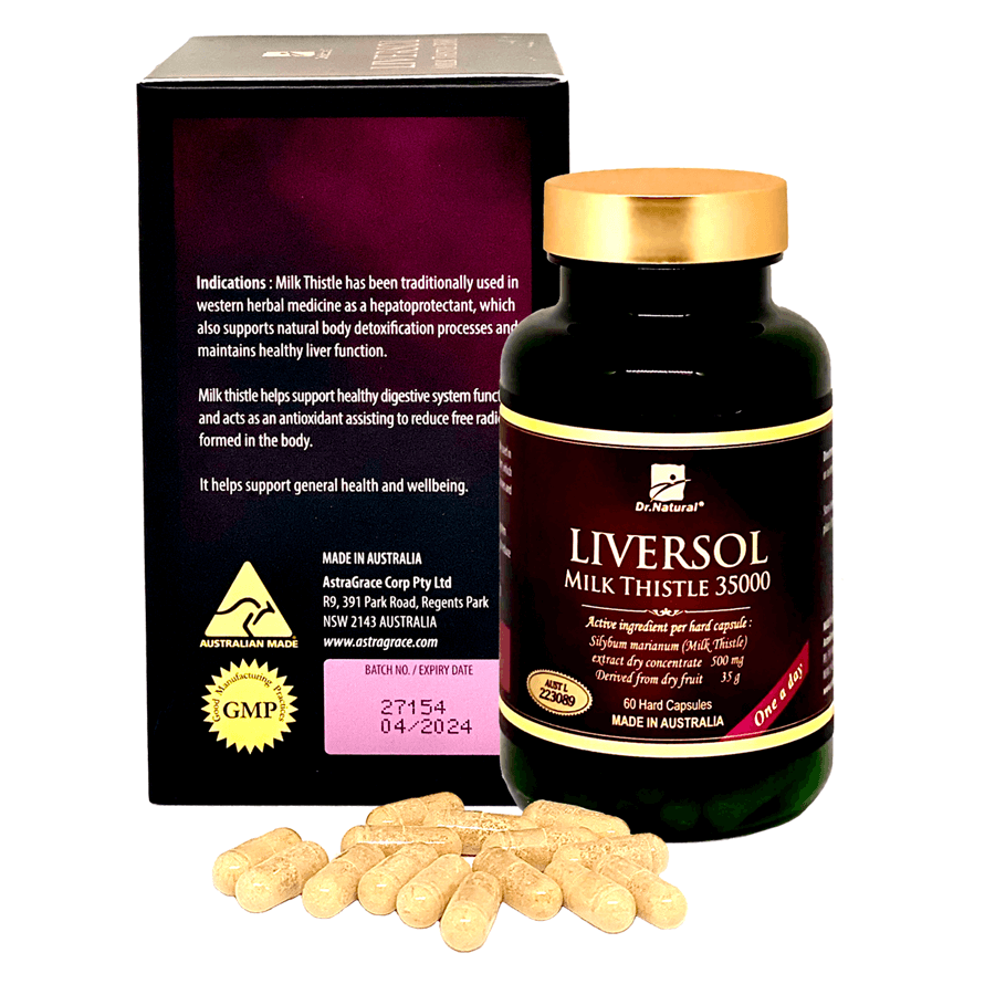 DR NATURAL LIVERSOL MILK THISTLE 35000 Bổ gan Dr Natural Liversol là một sản phẩm chất lượng của tập đoàn dược phẩm Astragrace (Úc). Astragrace nổi tiếng với những sản phẩm thực sự chất lượng