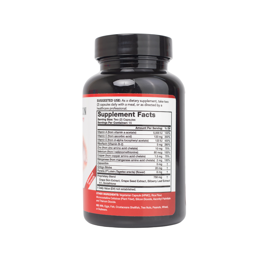 - Thành phần cấu tạo chính (02 viên): Vitamin A (từ vitamin vitamin a acetate) 5000IU, Vitamin C (từ ascorbic acid) 120mg, Vitamin E (từ d-alpha tocopheryl acetate) 120IU, Riboflavin (Vitamin B-2) 5mg, Kẽm (từ Zinc Amino acid chelate) 10mg, Selenium (từ I-selenomethionine) 80mcg, Đồng (từ copper amino acid chelate) 1,5mg, Mangan (từ manganese amino acid chelate) 2mg, Zeaxanthin 5mg, Chiết xuất cao bạch quả 20mg, Lutein (từ FloraGLO) (Tagetes erecta) (flower) 6mg, Chiết xuất hỗn hợp (Chiết xuất vỏ quả nho, chiết xuất hạt nhỏ, chiết xuất lá việt quất 4:1, Glutathion).