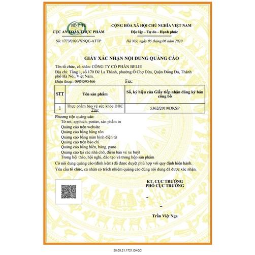Thực Phẩm Bảo Vệ Sức Khỏe DHC Zinc (30 ngày) Thực phẩm này không phải là thuốc và không có tác dụng thay thế thuốc chữa bệnh. Thành phần: - Mỗi viên có chứa: kẽm