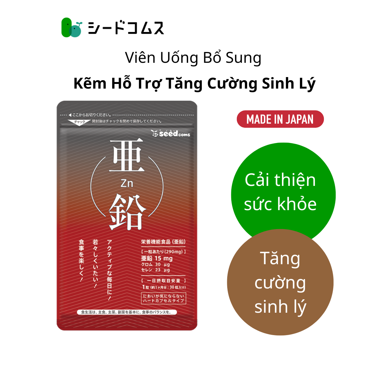 Viên uống hỗ trợ bổ sung kẽm Seedcoms Nhật Bản giúp bổ sung kẽm cho cơ thể, giúp tham gia vào quá trình chuyển hoá và phát triển cơ thể, đặc biệt là quá trình