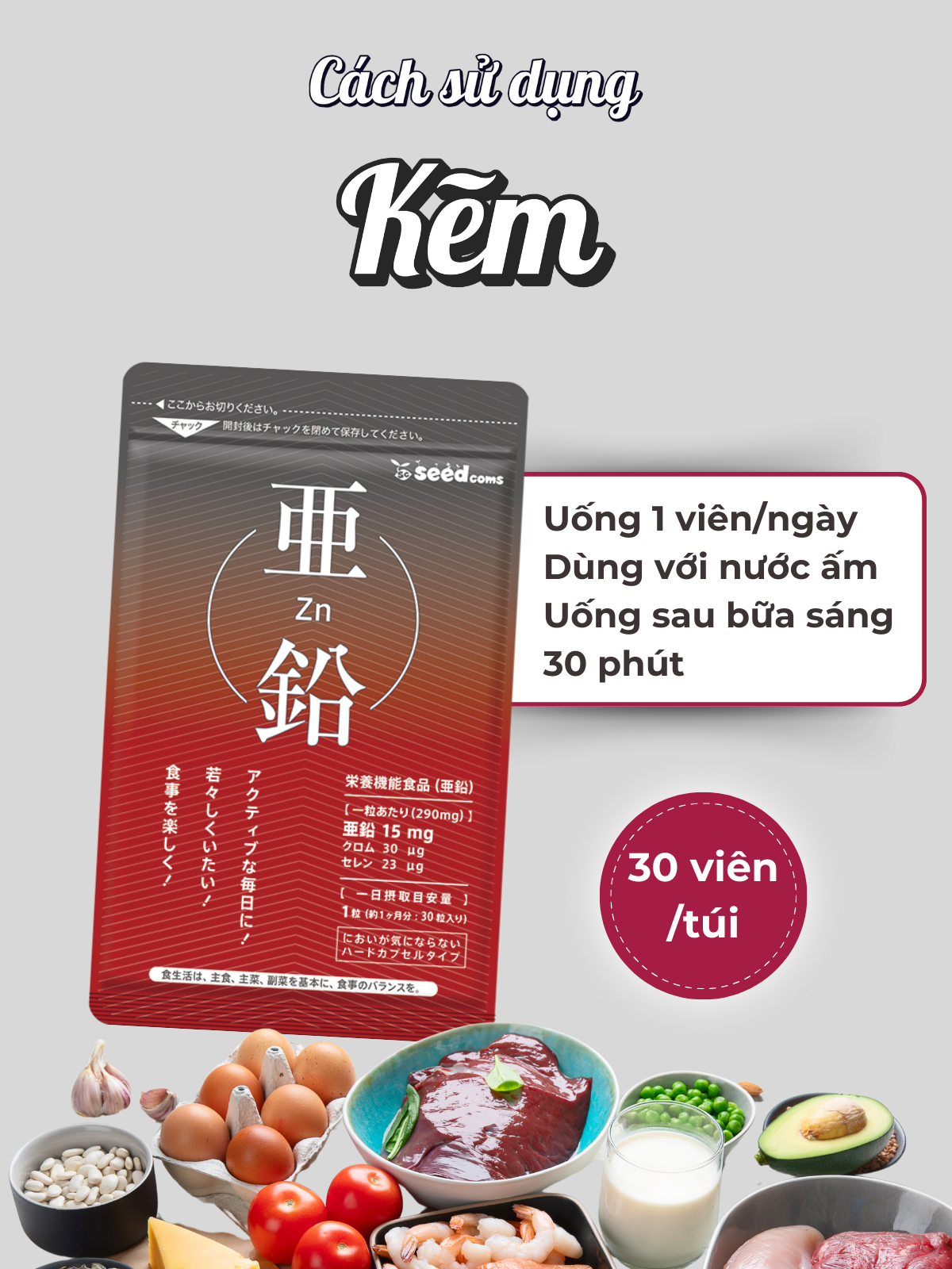 Mua tại TiktokViên uống hỗ trợ bổ sung kẽm Seedcoms Nhật Bản giúp bổ sung kẽm cho cơ thể, giúp tham gia vào quá trình chuyển hoá và phát triển cơ thể, đặc biệt là quá trình tổng hợp ADN, ARN, kích hoạt tế bào,… giúp bổ não, duy trì hệ xương chắc khỏe, cải thiện sức khỏe thị giác. THÀNH PHẦN CỦA SẢN PHẨM: Dextrin (sản xuất trong nước), men chứa crom, men chứa Selenium/kẽm gluconat, gelatin, canxi stearat, silic dioxit, màu caramel. CÔNG DỤNG CỦA SẢN PHẨM:
