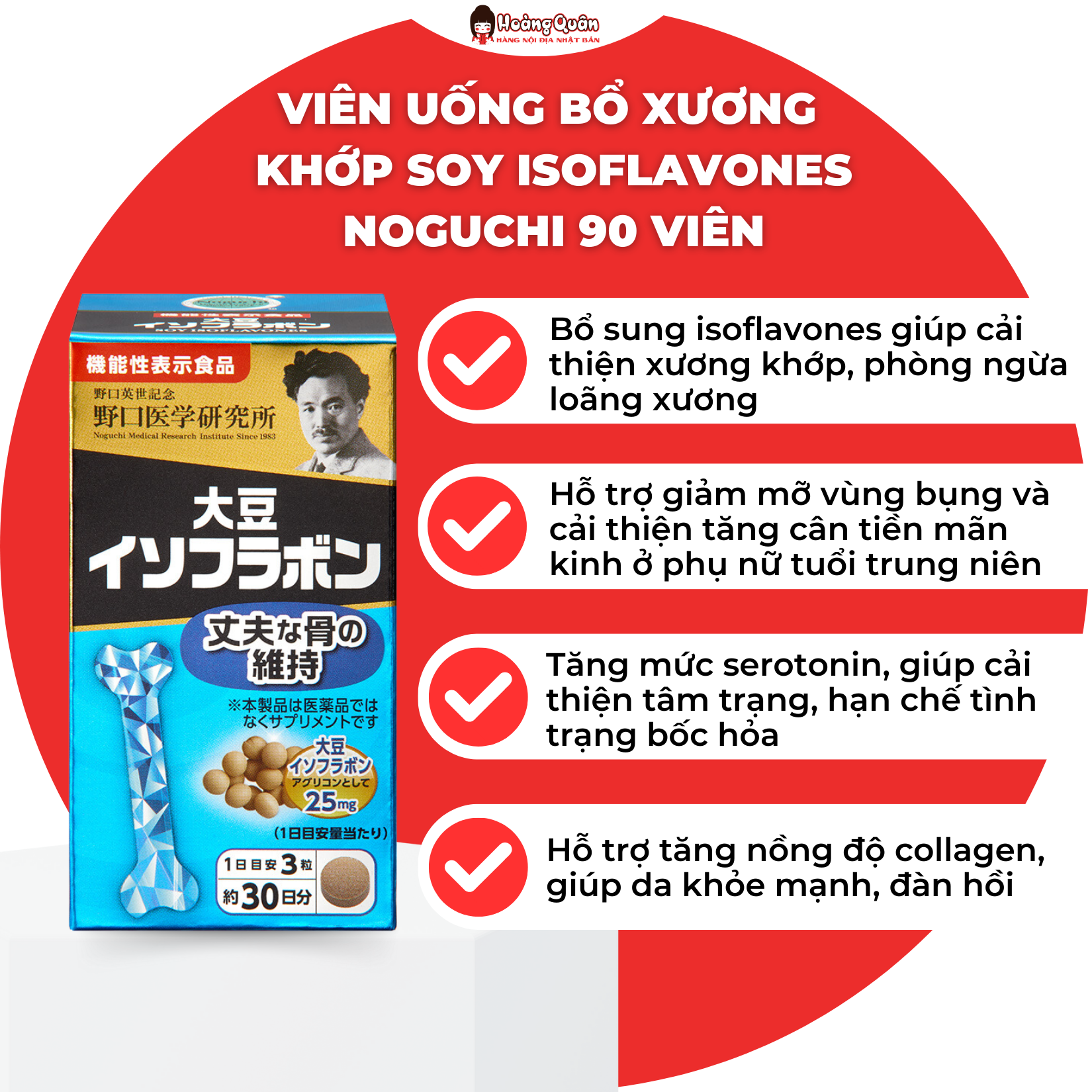 Viên uống chắc xương khớp Soy Isoflavones Noguchi 90 viên là sản phẩm nội địa Nhật Bản, có chứa isoflavone đậu nành, hỗ trợ duy trì thành phần xương, giúp xương chắc khoẻ. Thành phần Siro maltose Chiết xuất đậu nành Axit lactic Vitamin C Ferric pyrophosphate Stearat canxi Silicon dioxide Thông tin dinh dưỡng (mỗi 3 viên) Năng lượng…2,92kcal Đạm…0g Béo…0,04g Carbonhydrat…0,65g Lượng muối tương đương…0,0014g Isoflavone đậu nành (dưới dạng aglycones)…25mg Công dụng