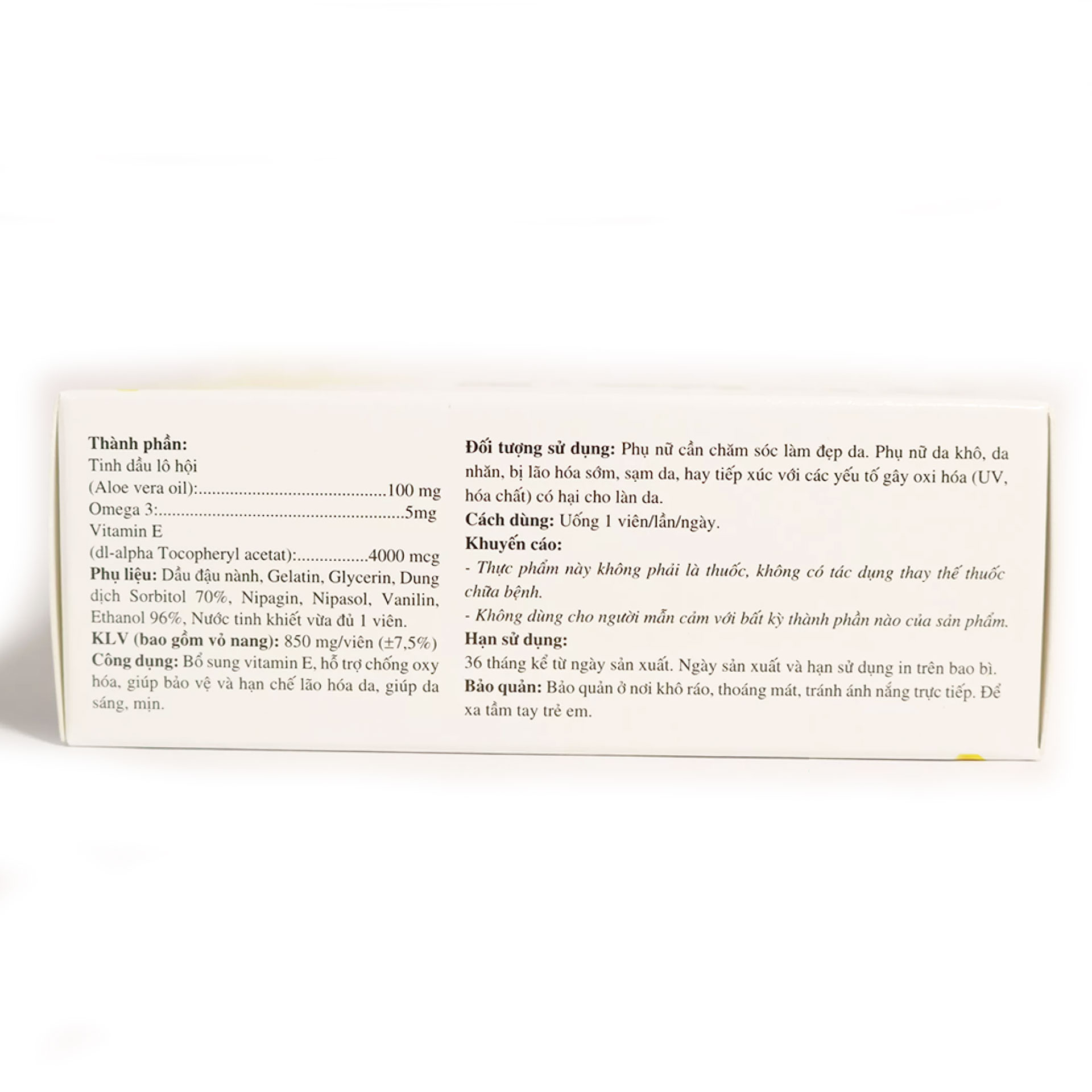 THÀNH PHẦN VITAMIN E ROSTEXVitamin E : 4000mcgOmega 3: 5mgTinh dầu Lô hội : 10mgPhụ liệu: Dầu đậu nành, Gelatin, Glycerin, Dung dịch Sorbitol 70%, Vanilin, Nipagin, Napisol, Ethanol 96%, Nước tinh khi...