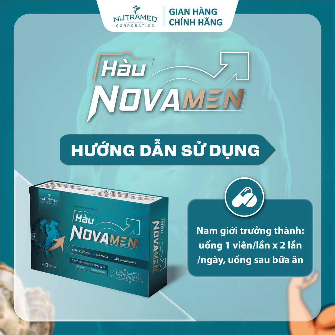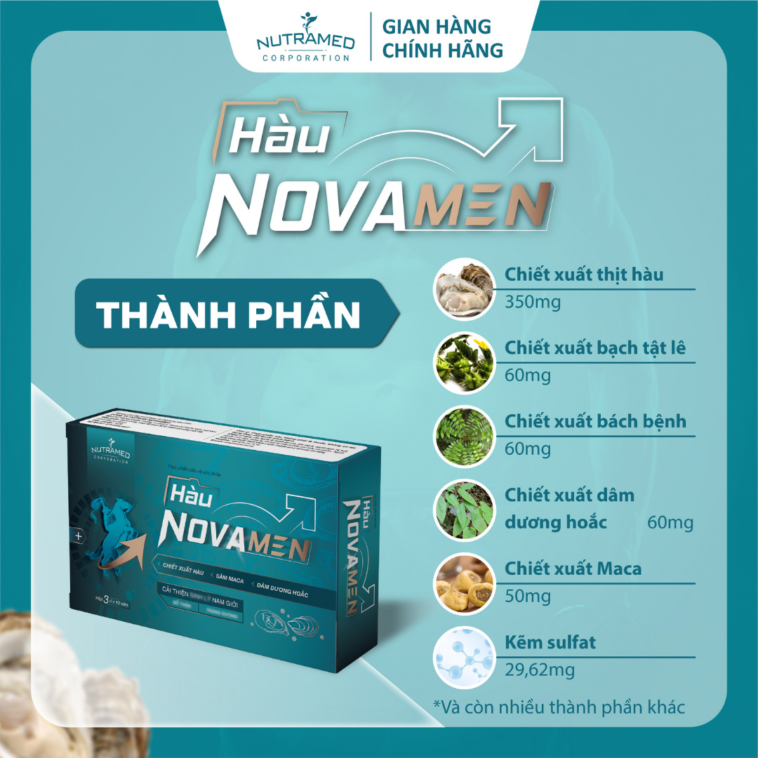 Hàu Novamen - Giải pháp hỗ trợ bổ thận, tráng dương, hỗ trợ cải thiện s.i.n.h l.ý nam   THÀNH PHẦN  ️  Chiết xuất thịt Hàu (Oyster extract powder); Chiết xuất Bạch tật lê (Tribulus terrestris extract); Chiết xuất Bách bệnh (Eurycoma Longifolia extract); Chiết xuất Dâm dương hoắc (Epimedium macranthum extract); Chiết xuất Maca (Lepidium meyenii extract); Kẽm sulfat; Chiết xuất Đông trùng hạ thảo (Cordyceps militaris); Vitamin B1 (Thiamin hydrochlorid); Vitamin B2 (Natri riboflavin -5 phosphate); Vitamin B6 (Pyridoxyl hydrochlorid)   CÔNG DỤNG    ️  Hỗ trợ bổ thận, tráng dương, hỗ trợ cải thiện s.i.n.h l.ý nam   ĐỐI TƯỢNG SỬ DỤNG  ️  Nam giới trưởng thành chức năng s.i.n.h l.ý yếu, thận kém.   HƯỚNG DẪN SỬ DỤNG  ️  Nam giới trưởng thành: uống 1 viên/lần x 2 lần/ngày, uống sau bữa ăn.   KHÔNG SỬ DỤNG TRONG TRƯỜNG HỢP  ️  Người mẫn cảm, kiêng kỵ với bất kỳ thành phần nào của sản phẩm.  ️  Người bị cao huyết áp, tim mạch.  ️  Người dưới 18 tuổi.   LƯU Ý  ️  Người đang dùng thuốc tham khảo ý kiến chuyên gia y tế trước khi dùng.  ️  Thực phẩm này không phải là thuốc, không có tác dụng thay thế thuốc chữa bệnh. BẢO QUẢN   ️ Nơi khô ráo, nhiệt độ dưới 30°C, tránh ánh sáng mặt trời.   ️ Để xa tầm tay trẻ em.   THÔNG TIN SẢN PHẨM Tên sản phẩm:  Hàu Novamen Quy cách: Hộp 30 vỉ x 10 viên Hạn sử dụng: 36 tháng  từ ngày sản xuất Tiêu chuẩn: TCCS _ NUTRAMED - KHƠI NGUỒN KHOA HỌC TỚI CUỘC SỐNG   Nhà máy đạt chuẩn WHO – GMP. Nguyên liệu được kiểm tra chất lượng khắt khe bởi nhà máy đạt chuẩn GMP.
