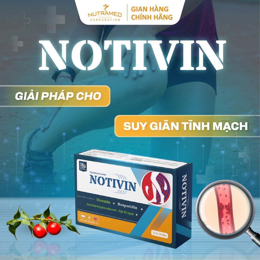 NOTIVIN - Với thành phần chiết xuất từ thảo dược thiên nhiên, lành tính, an toàn, được sử dụng với mục đích phòng và hỗ trợ bệnh nhân bị trĩ, bị giãn tĩnh mạch, suy giãn tĩnh mạch mãn tính   THÀNH PHẦN ️ Diosmin (dạng vi thể tinh chế), Ruscus aculeatus, Hesperidin (dạng vi thể tinh chế) (Tương đương với Rucogenine), Aesculus hippocastanum, Tá dược (Tương đương với Aescin)   CÔNG DỤNG ️ Hỗ trợ tăng cường sức bền thành mạch, giúp giảm nguy cơ suy giãn tĩnh mạch, hỗ trợ cải thiện các triệu chứng của trĩ.   ĐỐI TƯỢNG SỬ DỤNG ️ Người bị trĩ nội, trĩ ngoại với các biểu hiện: chảy máu, sa búi trĩ, đau rát hậu môn. ️Người có nguy cơ bị suy giãn tĩnh mạch.   HƯỚNG DẪN SỬ DỤNG ️ Uống ngày 2 lần, mỗi lần 1 viên, uống sau khi ăn 2 giờ  ️ Để có kết quả như mong muốn, phải sử dụng ít nhất 2-3 tháng. Sản phẩm có thể sử dụng lâu dài, sau mỗi chu kỳ sử dụng 3 tháng, nghỉ uống 2 tuần trước khi bắt đầu chu kỳ mới.   KHÔNG SỬ DỤNG TRONG TRƯỜNG HỢP ️ Người mẫn cảm với bất kỳ thành phần nào của sản phẩm  ️ Phụ nữ có thai và đang cho con bú   LƯU Ý ️ Sản phẩm này không phải là thuốc, không có tác dụng thay thế thuốc chữa bệnh   BẢO QUẢN  ️ Phải được được bảo quản ở nơi khô mát, tránh ánh sáng, dưới 30 độ C.  ️ Không sử dụng sản phẩm quá 36 tháng kể từ ngày sản xuất. Ngày sản xuất và hạn sử dụng được in trên nhãn vỏ hộp.   THÔNG TIN SẢN PHẨM Tên sản phẩm: Notivin Quy cách: Hộp 30 viên Hạn sử dụng: 3 năm từ ngày sản xuất Tiêu chuẩn: TCCS   _ NUTRAMED - KHƠI NGUỒN KHOA HỌC TỚI CUỘC SỐNG   Nhà máy đạt chuẩn WHO – GMP. Nguyên liệu được kiểm tra chất lượng khắt khe bởi nhà máy đạt chuẩn GMP.