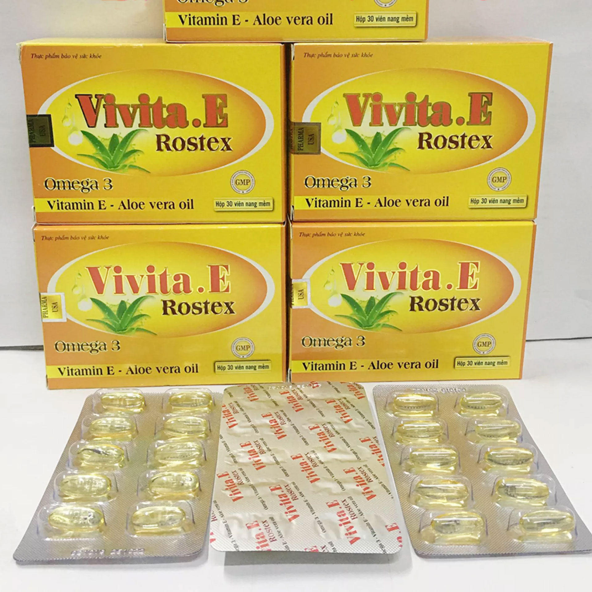 THÀNH PHẦN VITAMIN E ROSTEX Vitamin E : 4000mcg Omega 3: 5mg Tinh dầu Lô hội : 10mg Phụ liệu: Dầu đậu nành, Gelatin, Glycerin, Dung dịch Sorbitol 70%, Vanilin, Nipagin, Napisol, Ethanol 96%, Nước