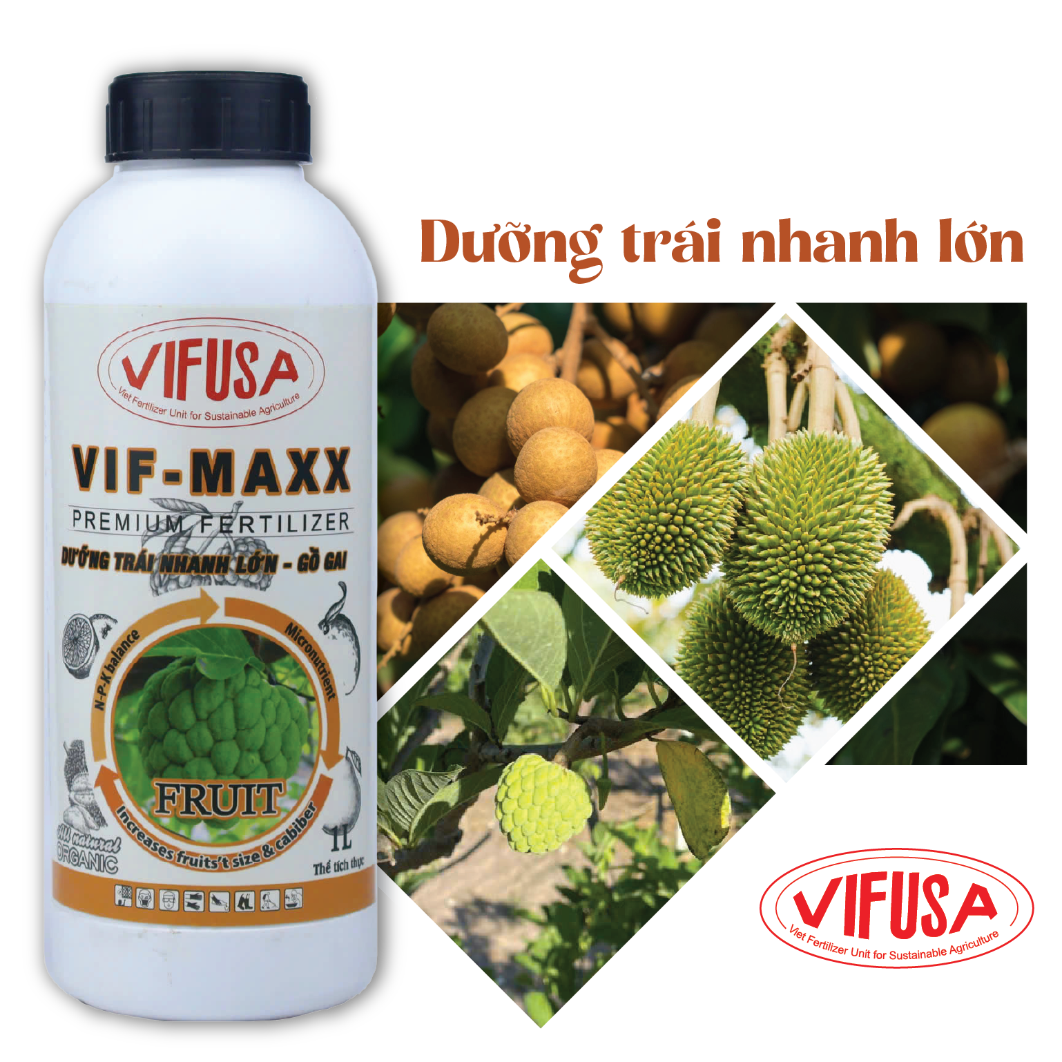 Mua tại TiktokVIF-MAXX là sản phẩm phân bón dạng lỏng dòng cao cấp PREMIUM, đáp ứng đầy đủ nhu cầu dinh dưỡng đa trung vi lượng ở giai đoạn trái non, giúp trái phát triển nhanh thần kỳ.