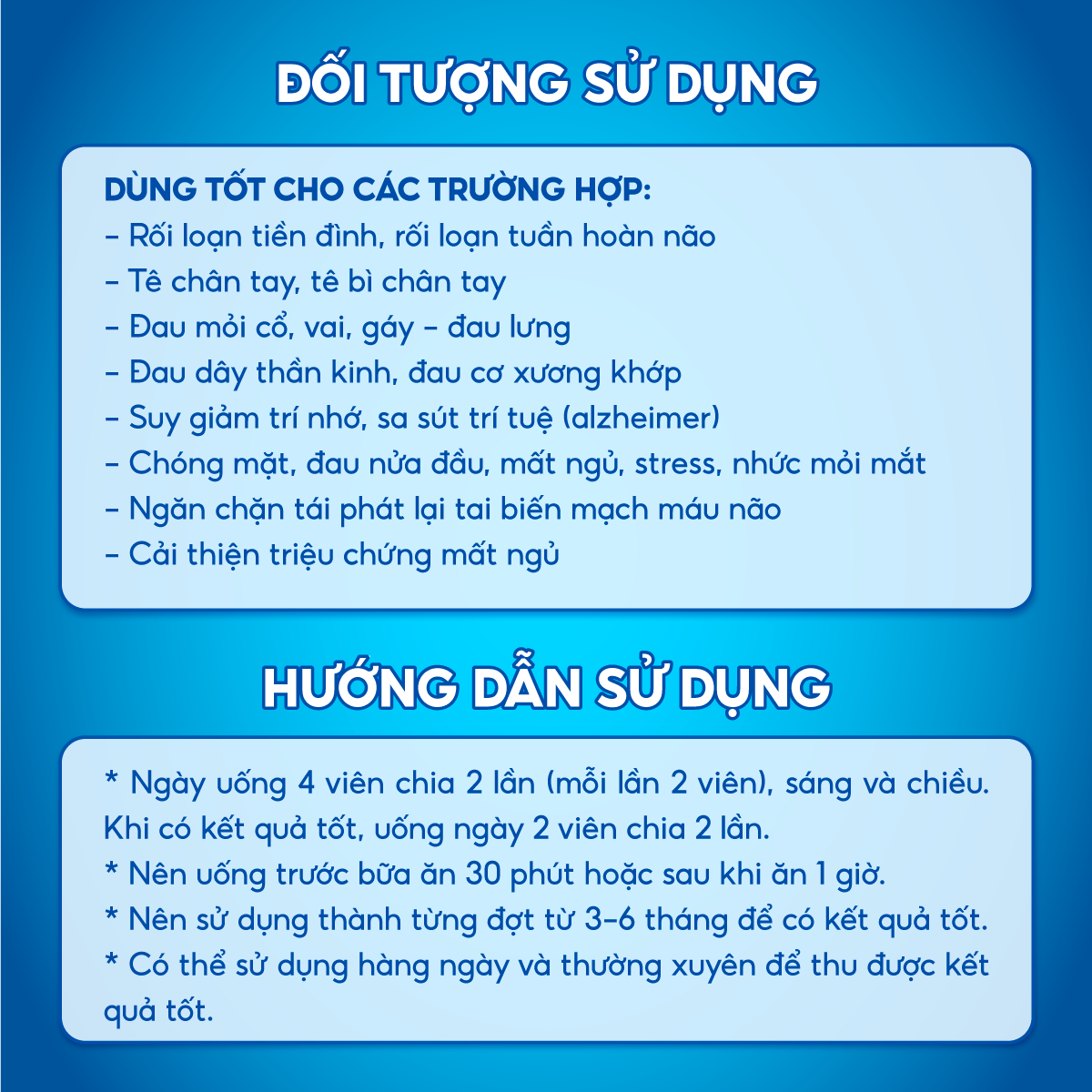- THÀNH PHẦN ƯU VIỆT, TOÀN DIỆN: Chứa bộ 4 thành phần gồm Fursultiamin, Ginkgo Biloba, Cao Blueberry, Chondroitin giúp tăng cường lưu thông máu và bảo vệ hệ thần kinh