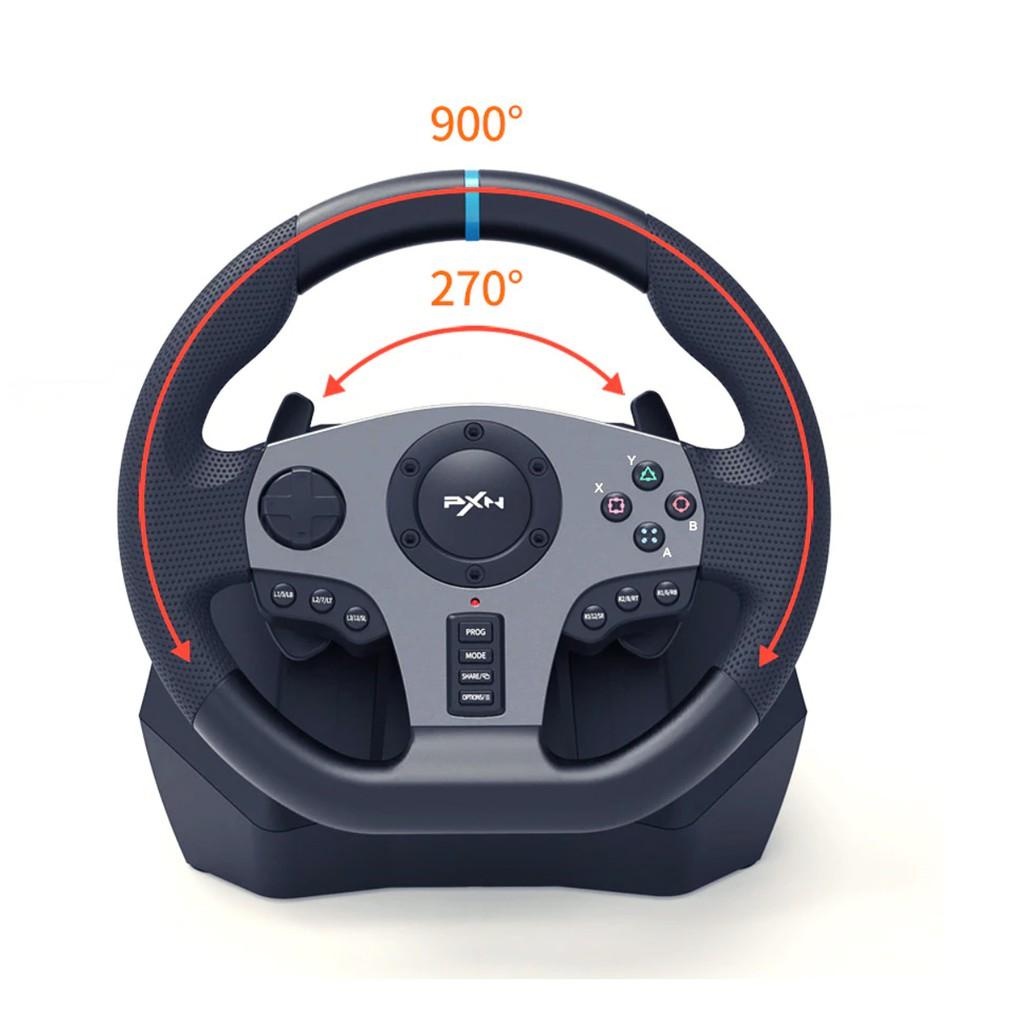- Các nút cấu hình trên PXN V9 có thể được lập trình chức năng tùy theo sở thích của bạn. Hướng dẫn cài đặt tinh chỉnh độ nhạy ( sensitive) của vô lăng PXN V9 : TẮT XBOX ONE / tay game PS4 có sẵn khi cắm vô lăng để ưu tiên vô lăng PXN Ấn và giữ nút PROG đến khi đèn đỏ ở phía trên nháy liên tục rồi ấn nút lên UP bên phải vô lăng để có độ nhạy cao nhất. ( mũi tên sang trái hoặc xuống dưới để giảm độ nhạy ). **Để Reset các seting bạn chọn PROG giữ nguyên đến khi đèn nháy và ấn tiếp nút OPTION trong 4-5s để trở về bình thường. Tương thích với nhiều nền tảng Vô lăng PXN V9 tương thích với rất nhiều nền tảng, bao gồm: PC / PS3 / PS4 / Xbox One / Nintendo Switch. Mỗi nền tảng đều có những tựa game đua xe hấp hẫn phù hợp cho việc sử dụng vô lăng chơi game Góc quay rộng Vô lăng PXN V9 có góc quay 270 độ cho các game đua xe truyền thống, và góc quay 900 độ phù hợp với các game đua xe dạng mô phỏng Tuỳ chỉnh qua App dễ dàng Vô lăng PXN V9 có thể kết nối với điện thoại và có thể tuỳ chỉnh thông qua ứng dụng trên điện thoại Android hoặc IOS Mô tơ rung Bộ mô tơ rung được tích hợp giúp cho chiếc vô lăng có phản hồi chân thực nhất, tạo cảm giác thật hơn cho người dùng Cần số chữ H Với phiên bản V9 còn đi kèm thêm cả cần số tương tự những chiếc vô lăng cao cấp. Người dùng có thể điều chỉnh giữa 2 chế độ Auto (Tự động) và Manual (Số sàn) phù hợp cho nhu cầu Bàn đạp nhanh nhạy Bàn đạp với đầy đủ chức năng như đạp ga, phanh và chân côn được làm bằng kim loại chắc chắn. Bạn có thể điều khiển chiếc xe một cách chân thực như ngoài đời