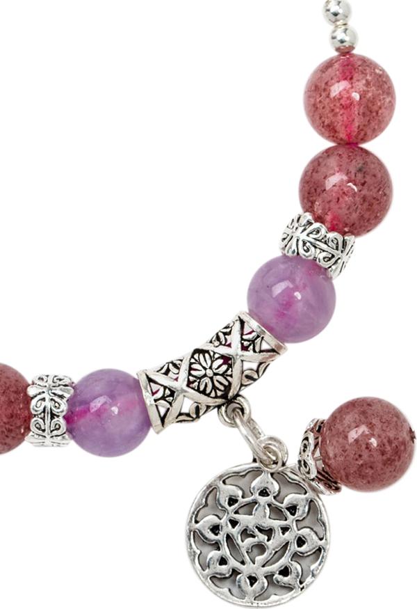 - Vòng Tay Thạch Anh Dâu Mix Tím Ngọc Charm Hoa Mặt Trời Ngọc Quý Gemstones VT109 mang màu hồng nhẹ nhàng, chứa năng lượng bổ trợ mạnh mẽ về tình duyên, cải thiện các