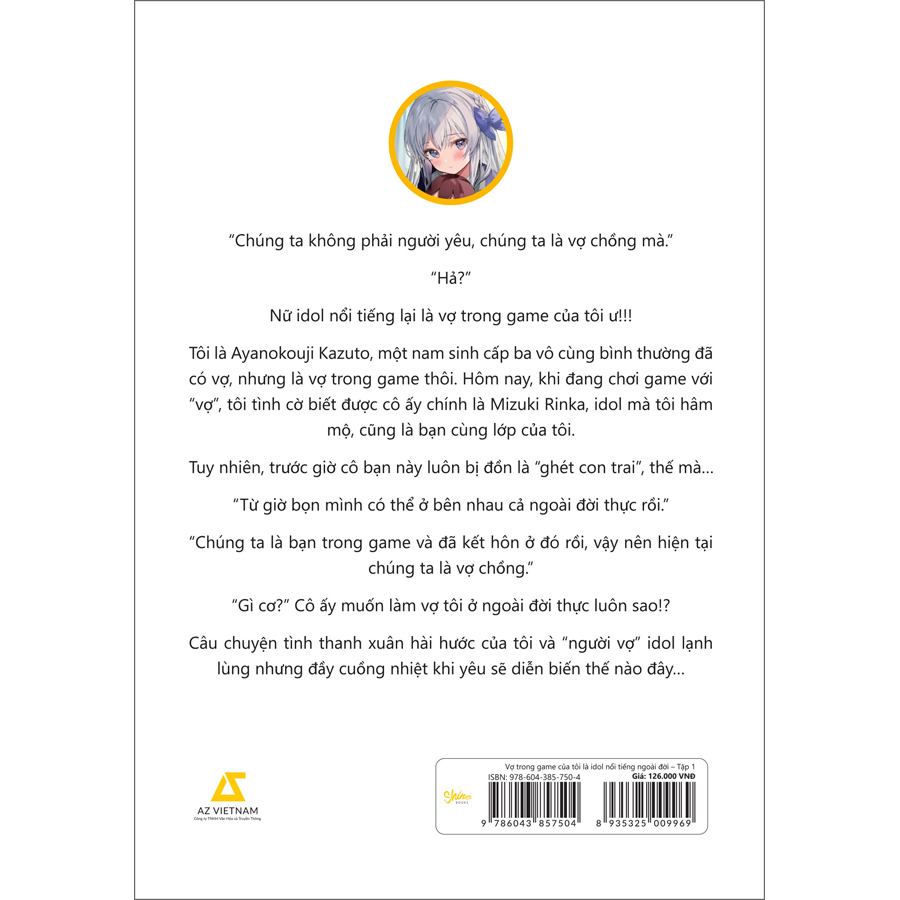 - 1 huy hiệu phủ nhũ để ở ngoài Bản thường: Tặng kèm 1 bookmark bế in 1 mặt Vợ Trong Game Của Tôi Là Idol Nổi Tiếng Ngoài Đời (Tập 1) “Chúng ta không phải người yêu, chúng ta là vợ chồng mà.” “Hả?” Nữ idol nổi tiếng lại là vợ trong game của tôi ư!!! Tôi là Ayanokouji Kazuto, một nam sinh cấp ba vô cùng bình thường đã có vợ, nhưng là vợ trong game thôi. Hôm nay, khi đang chơi game với “vợ”, tôi tình cờ biết được cô ấy chính là Mizuki Rinka, idol mà tôi hâm mộ, cũng là bạn cùng lớp của tôi. Tuy nhiên, trước giờ cô bạn này luôn bị đồn là “ghét con trai”, thế mà… “Từ giờ bọn mình có thể ở bên nhau cả ngoài đời thực rồi.” “Chúng ta là bạn trong game và đã kết hôn ở đó rồi, vậy nên hiện tại chúng ta là vợ chồng.” “Gì cơ?” Cô ấy muốn làm vợ tôi ở ngoài đời thực luôn sao!? Câu chuyện tình thanh xuân hài hước của tôi và “người vợ” idol lạnh lùng nhưng đầy cuồng nhiệt khi yêu sẽ diễn biến thế nào đây… Trích dẫn trong sách: “Tớ chỉ thích một mình cậu thôi, không phải cậu thì sẽ chẳng là ai khác nữa.” “… Kazuto…” “Yêu một ai đó chính là chấp nhận mọi thứ thuộc về đối phương, chứ không phải áp đặt những lý tưởng và kỳ vọng của bản thân lên người ấy mà.”