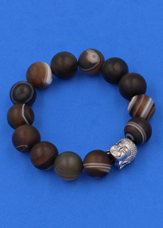 ✨Vòng đeo tay Mã Não Nâu Sọc mờ 14 ly cẩn hạt Phật A Di Đà inox bạc VMNNSMNLT14 - hợp mệnh Kim, mệnh Thổ