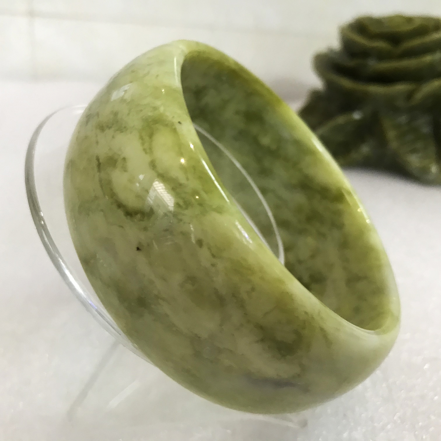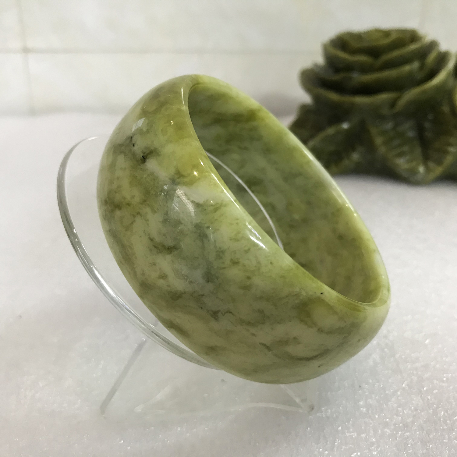 1.Chất: Đá ngọc Serpentine xanh lá nhạt 100% đá tự nhiên khai thác và chế tác tại Việt Nam, màu sắc đẹp y như hình 2. Kích thước: Chiều cao của vòng là 2.5-2.9 cm.