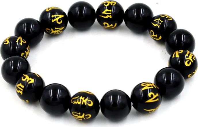 Màu đen , khắc và mạ vàng Phật chú trên hạt chuỗi.