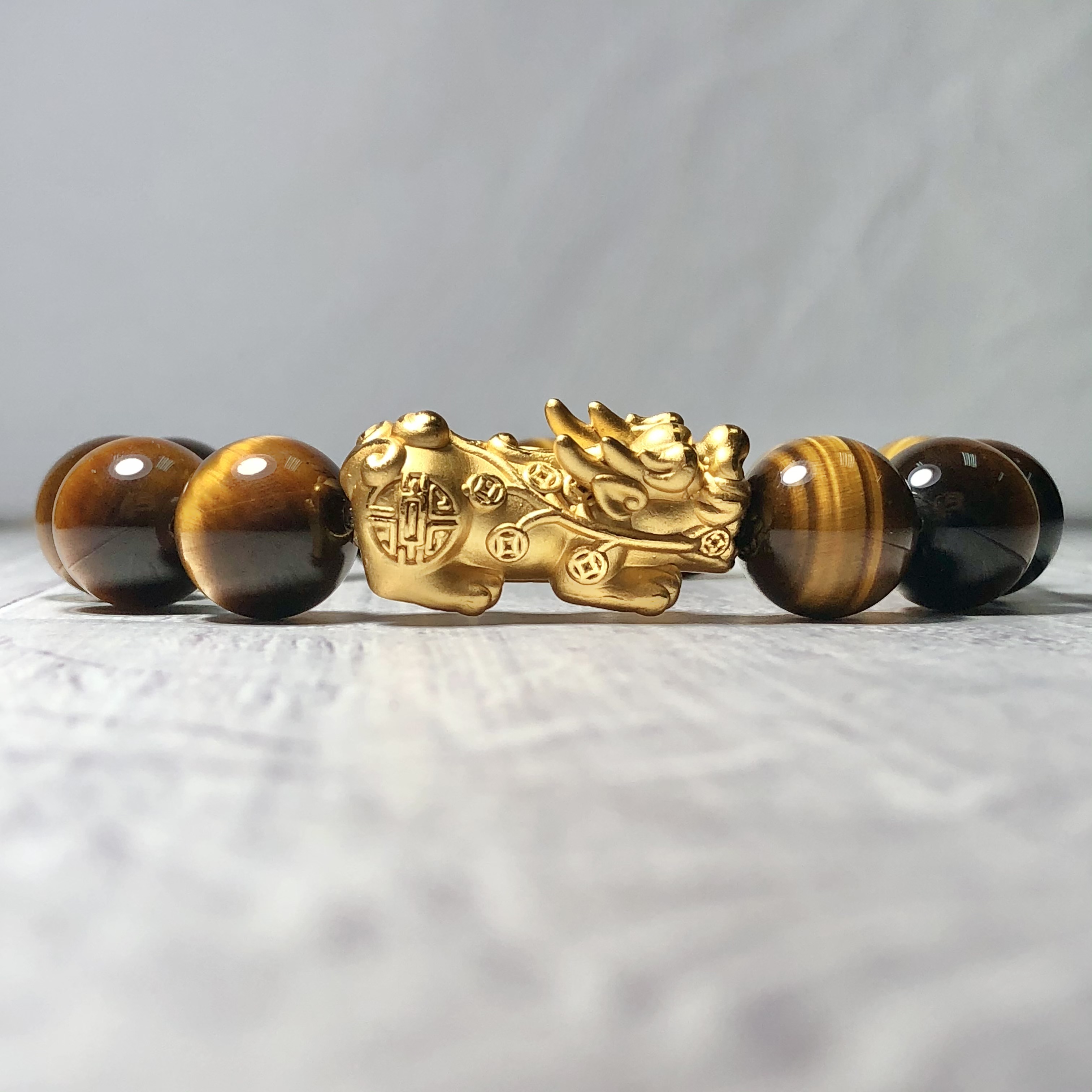 Vòng tay đá mắt hổ vàng nâu 14 ly mix tỳ hưu I Công dụng đá mắt hổ vàng nâu trong phong thủy