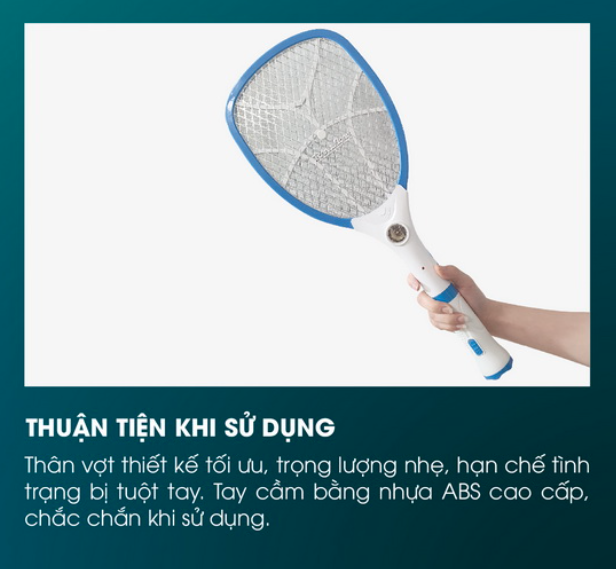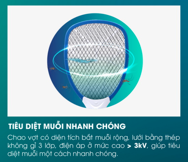 - Lưới vợt thiết kế 3 lớp tiêu diệt muỗi nhanh chóng.