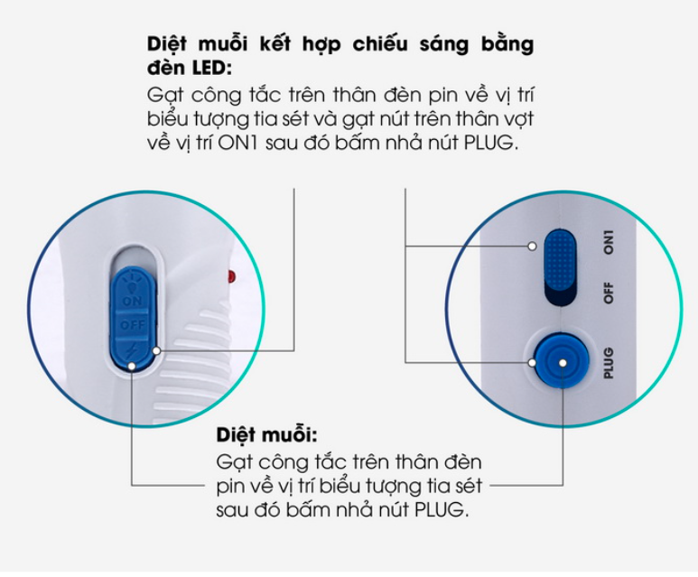 - Sản phẩm có 3 chế độ hoạt động: Diệt muỗi; Diệt muỗi và chiếu sáng bằng đèn LED; Đèn pin LED tháo rời.