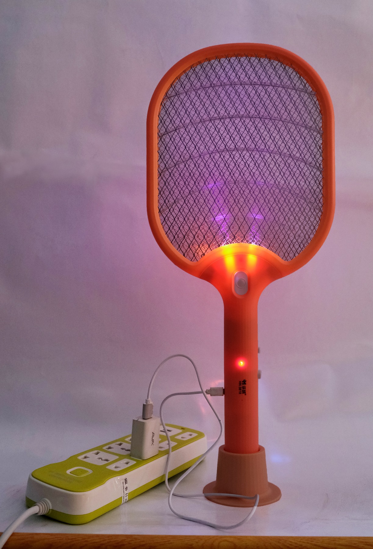 - Lần đầu tiên sử dụng: sạc đầy thiết bị trong khoảng 4-6 tiếng. Sử dụng ổ cắm sạc DC: 4.2-5V (sạc điện thoại iphone, android, các loại ổ điện có cổng sạc usb…). Khi sạc, cần gạt công tắc nguồn về vị trí OFF. Sau đó đặt vợt muỗi vào đế sạc, đèn sạc sẽ báo thời gian sạc đầy pin khoảng 3-4h.