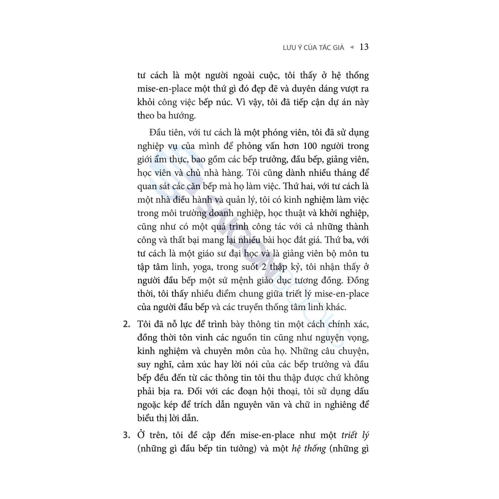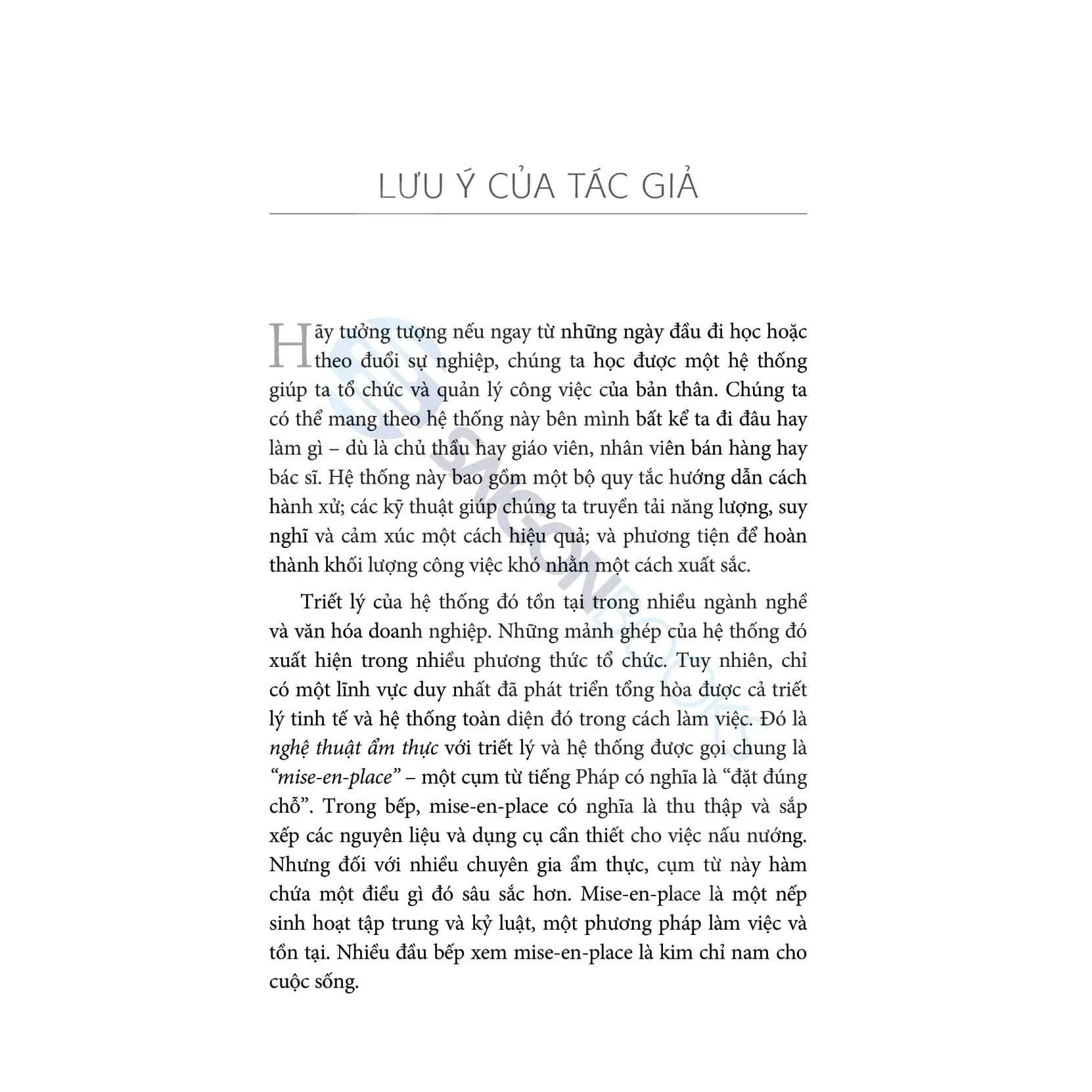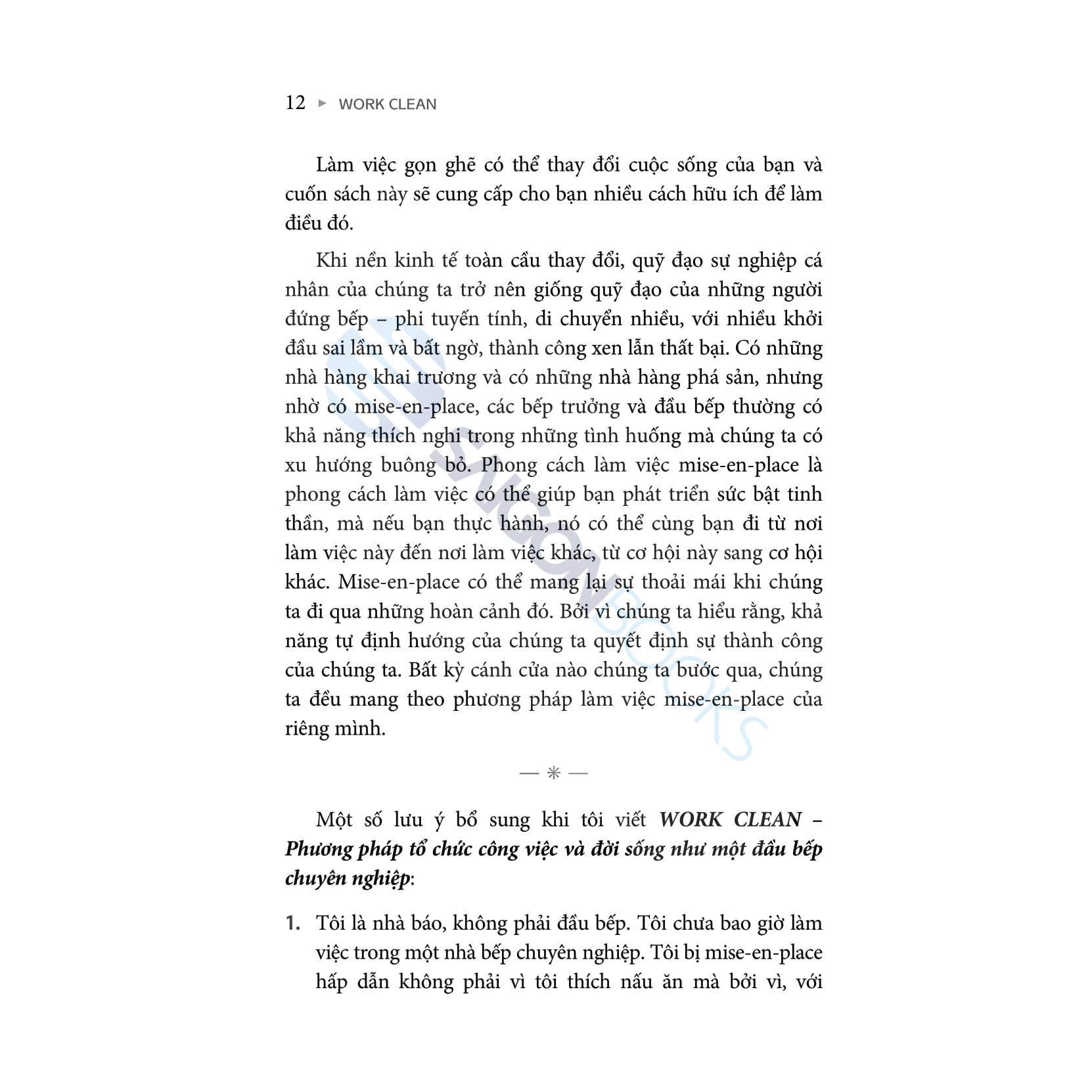 Work Clean - Phương Pháp Tổ Chức Công Việc Và Đời Sống Như Một Đầu Bếp Chuyên Nghiệp “Trong Work Clean, Dan Charnas phác thảo sự tương đồng quý giá giữa các hệ thống được sử dụng để tổ chức một nhà bếp bận rộn và cách chúng ta tổ chức cuộc sống hàng ngày. Là một đầu bếp, tôi biết rất rõ tầm quan trọng của việc chuẩn bị, lập kế hoạch và làm việc sạch sẽ. Charnas mô tả cách áp dụng những nguyên tắc của mise-en-place cho các công việc ngoài bếp để cải thiện hiệu quả và chất lượng công việc, và chất lượng cuộc sống.”—Eric Ripert, đầu bếp điều hành và đồng sở hữu Nhà hàng Le Bernardin, một trong những nhà hàng tốt nhất thế giới bởi các tạp chí ẩm thực và nhận được đánh giá tối đa bốn sao từ The New York Times và ba sao từ Michelin Guide. "WORK CLEAN trong cuộc sống hàng ngày như một đầu bếp sao Michelin là một trong những con đường tốt nhất mà tôi đã tìm ra để tạo ra những tác phẩm một cách mạnh mẽ và sáng tạo sâu sắc." - Tiago Forte, nhà sáng lập của Forte Labs và tác giả của cuốn sách "Building a Second Brain" và "The PARA Method". Bạn có từng thắc mắc vì sao các đầu bếp tại các nhà hàng Michelin cao cấp hằng ngày thực hiện rất nhiều món ăn liên tục nhưng vẫn đảm bảo được chất lượng của chúng luôn đạt chuẩn nhất? Bạn thấy sự bận rộn và hỗn loạn trong bếp luôn diễn ra nhưng một cách nào đó, chúng dường như vẫn "rất có" quy tắc? “Mise en place” là thuật ngữ quen thuộc của giới ẩm thực, có nghĩa là “sắp xếp mọi thứ đúng chỗ”. Mise en place không chỉ là một nguyên lý áp dụng trong bếp, mà còn là một triết lý sống, áp dụng vào công việc và cuộc sống hằng ngày để bạn nâng cao năng suất, giảm căng thẳng và cải thiện cuộc sống thông qua các quy tắc được tác giả Dan Charnas đúc kết và chia sẻ trong “WORK CLEAN - Phương pháp tổ chức công việc và đời sống như một đầu bếp chuyên nghiệp”. “WORK CLEAN” được chia thành 3 “món”, bạn sẽ được: “Khai vị” với Sức mạnh của Work Clean: Khám phá cách thức hoạt động của mise-en-place và sự cần thiết của việc tổ chức trong mọi khía cạnh của cuộc sống. “Món chính” với Nguyên liệu để Work Clean: 10 nguyên tắc cơ bản tương ứng với một chương riêng biệt, “WORK CLEAN” giúp người đọc dễ dàng áp dụng các nguyên tắc của "mise en place" vào cuộc sống hàng ngày gồm: lên kế hoạch, sắp xếp không gian, làm tới đâu gọn tới đó, thực hiện bước đầu tiên, hoàn tất hành động, chậm lại để tăng tốc, mở mắt và dỏng tai, yêu cầu và đáp lại, kiểm tra và sửa chữa, tận dụng tối đa. Mỗi nguyên tắc không chỉ là một hành vi cụ thể mà còn là một khía cạnh quan trọng trong việc xây dựng thói quen làm việc hiệu quả. “Tráng miệng” với Work Clean như một lối sống: Hướng dẫn bạn xây dựng thói quen làm việc gọn gàng, từ đó phát triển sự nghiệp và cuộc sống cá nhân một cách bền vững. Để thực hiện cuốn sách này, tác giả đã tiến hành phỏng vấn hơn 100 người trong giới ẩm thực, bao gồm các bếp trưởng, đầu bếp, giảng viên, học viên và chủ nhà hàng. Ông cũng dành nhiều tháng để quan sát các căn bếp mà họ làm việc, từ đó, hé lộ bí quyết sắp xếp và giải quyết các vấn đề trong cuộc sống. Ngoài ra, tác giả cũng xây dựng các bài tập ngắn để bạn thực hành mise en place một cách dễ dàng. “mise-en-place là một triết lý về cách bắt đầu và hoàn thành mọi thứ, cách tăng tốc và cách chậm lại, cách nói “có” với một số việc và “không” với một số việc khác. Và như vậy, khi được thực hành một cách có ý thức, mise-en-place có thể hữu ích trong việc tạo ra sự cân bằng.” “Mỗi giai đoạn công việc lại đòi hỏi một cách mise-en-place khác nhau và trật tự sắp xếp trong giai đoạn trước đó cần được “xóa dấu vết” trước khi trật tự mới được tạo ra” "WORK CLEAN - Phương pháp tổ chức công việc và đời sống như một đầu bếp chuyên nghiệp" không chỉ dành cho những người làm việc trong ngành ẩm thực mà còn cho bất cứ ai muốn cải thiện kỹ năng quản lý thời gian và công việc. Cuốn sách cung cấp những bài học quý giá, giúp bạn nhận ra rằng sự chuẩn bị và tổ chức có thể mang lại sự thành công trong mọi lĩnh vực.
