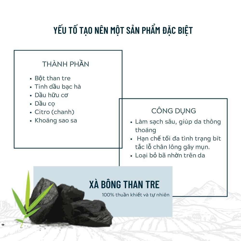 - Thành phần: Bột than tre, tinh dầu bạc hà, dầu hữu cơ, dầu cọ, citro (chanh), sao sa, nước khoáng tinh khiết.