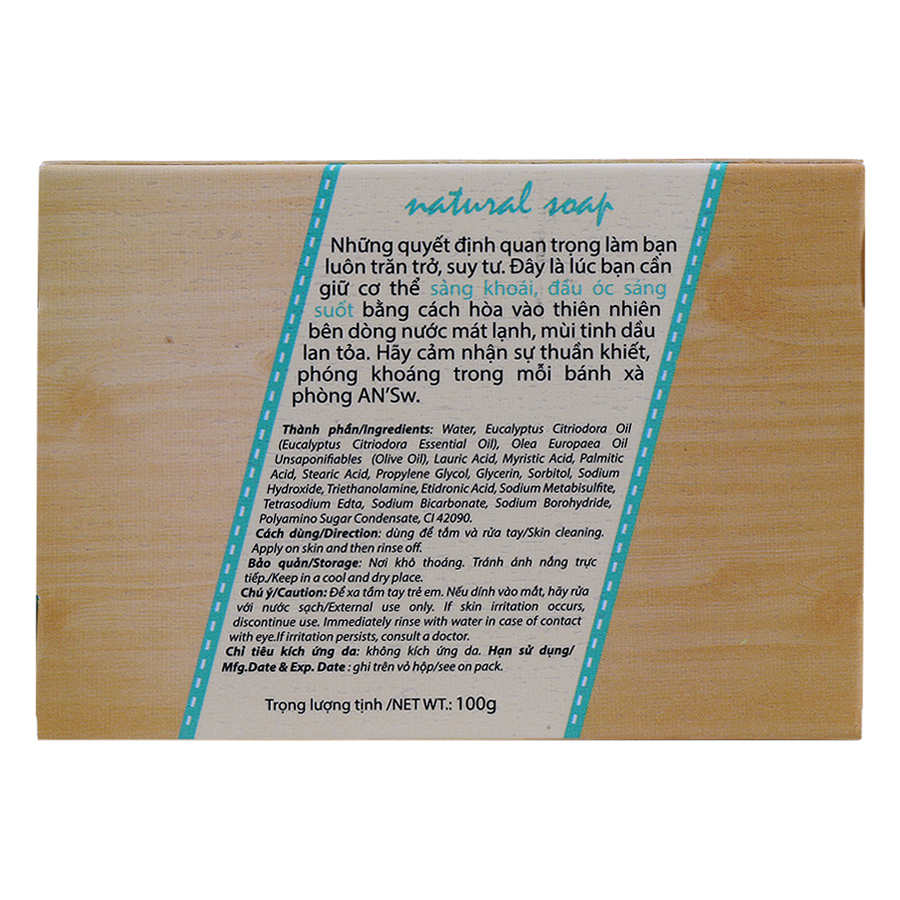 Xà Phòng Thiên Nhiên AN'Sw Tinh Dầu Bạch Đàn Chanh [Men] Với sự kết hợp giữa tinh dầu Bạch Đàn Chanh, dầu Olive và Glycerin xà phòng thiên nhiên An’sw giúp làm sạch và không gây khô da, dưỡng da mềm mại. Tinh dầu Bạch Đàn Chanh dễ chịu, thoang thoảng mùi sả, chanh dịu nhẹ, mùi hương mạnh mẽ nhưng không kém phần thanh mát, giúp sảng khoái tinh thần.