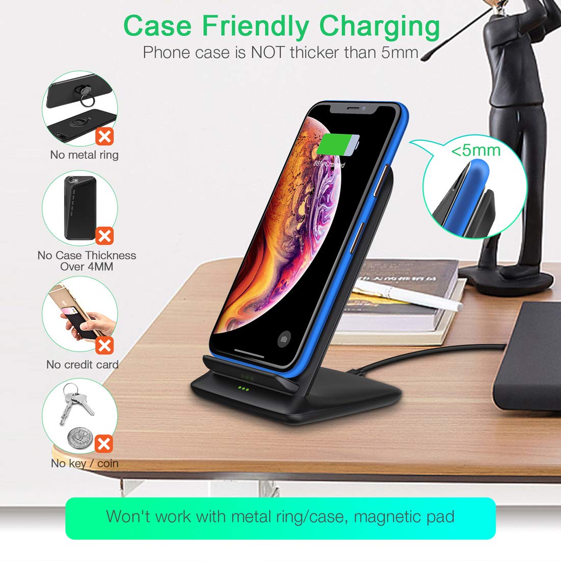 Có thể sạc ngay cả khi điện thoại đang sử dụng ốp lưng hoặc bao da, chỉ cần đảm bảo độ dày của chúng không quá 5 mm