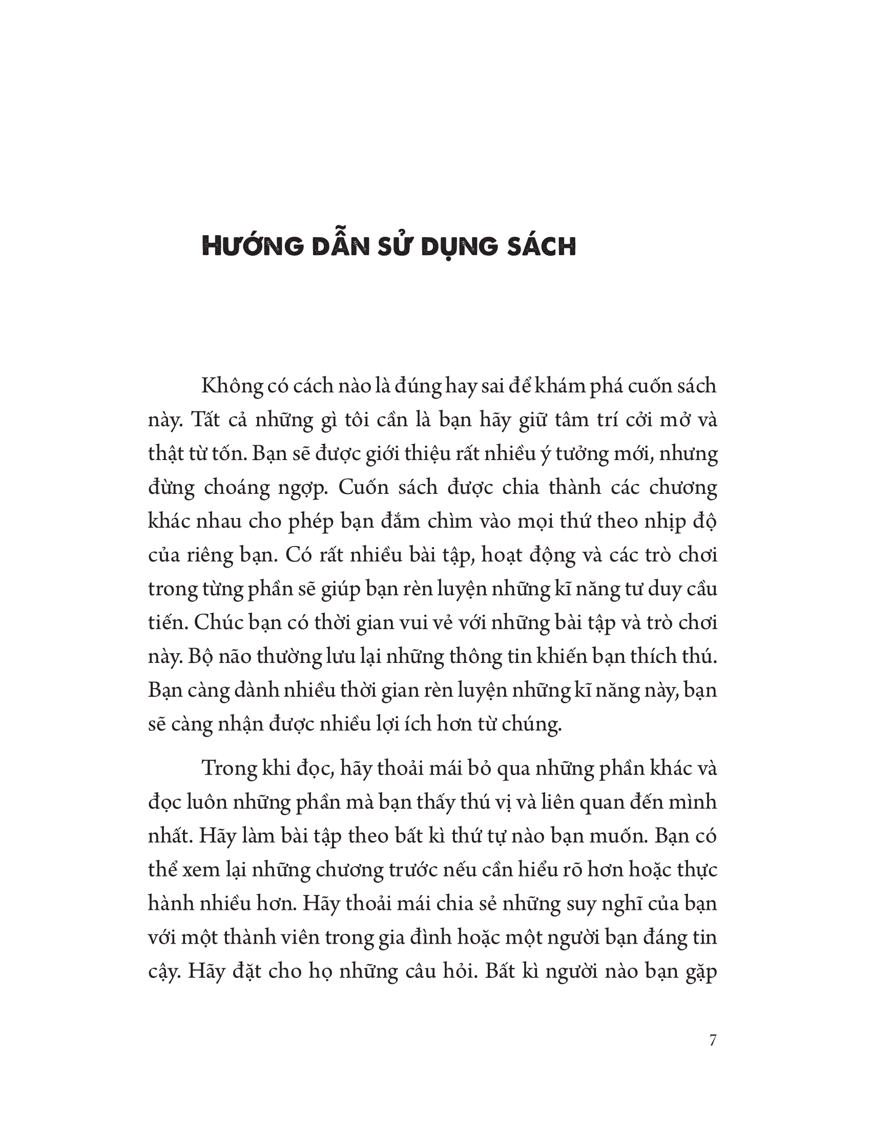 Bạn hãy coi cuốn sách này như một nơi an toàn. Đây không phải là một cuốn sách giáo khoa, bạn sẽ không bị kiểm tra khi đọc xong. Hãy tử tế với chính mình khi bạn thử những điều mới và khám phá những cách thức khác nhau để giải quyết thử thách. Hãy nhớ rằng, không ai thực hiện hoàn hảo ngay lần đầu. Vì thế, hãy cầm lấy một cây bút, đội chiếc mũ sáng tạo của bạn và bắt đầu thôi!
