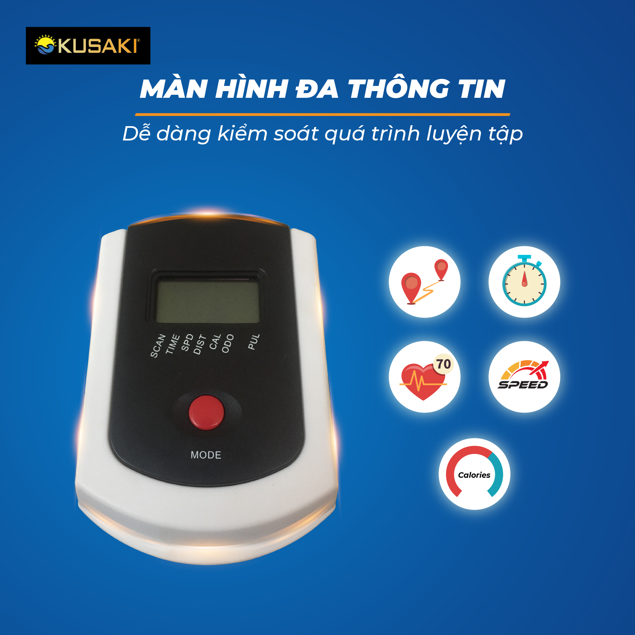 Trọng lượng tối đa người sử dụng: 125kg Cốt thanh tay cầm và yên xe bằng crom Màn hình LED hiển thị trực quan, dễ dàng quan sát Trang bị giá đựng chai nước và
