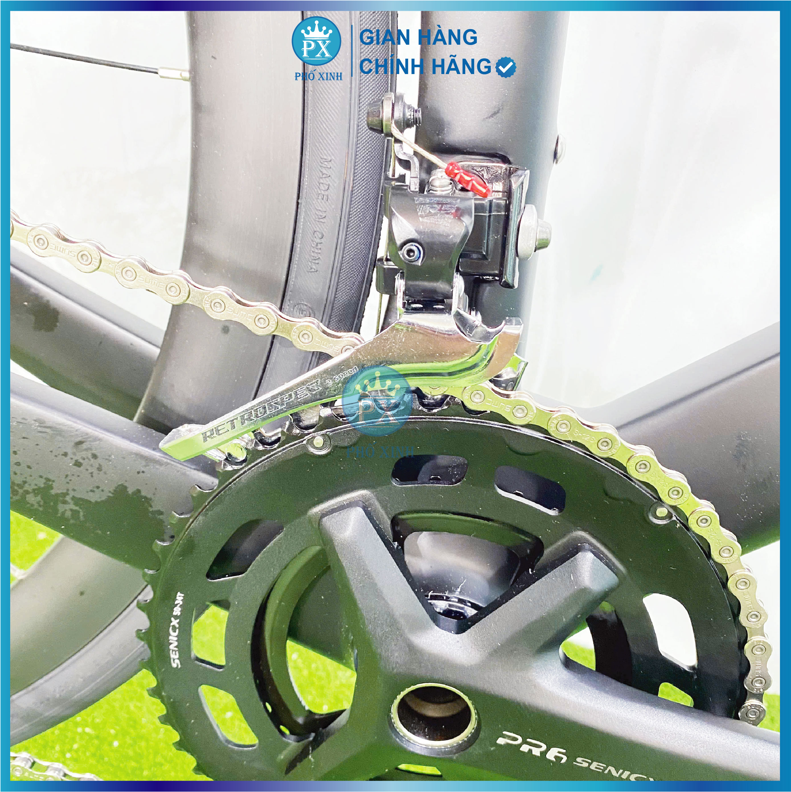- KHUNG • Khung : Carbon , dây cap âm toàn phần • Kích cỡ/ Sizes: 46.48 • Phuộc: C a r b o n tổng hợp • Tay đề: R e t r o s p e c 2*12 speed • Đề trước: R e t r o s p e c 2 speed • Đề sau : Củ đề: R e t r o s p e c 12 speed • Líp: Thả 12 tầng • Đùi đĩa: S E N I C X PR5 -Trục rỗng - Nhôm 2 đĩa, cốt BB • Xích S U M C • Phanh: Phanh đĩa cơ dầu R e t r o s p e c • Tay phanh: R e t r o s p e c • Vành xe/ Rims : R E T R O S P E C- Vành nhôm 2 lớp cao 4cm • Moay ơ/ Hubs: R E T R O S P E C CNC cối nổ • Lốp xe/ Tires: I n n o v a Pro 700x25C