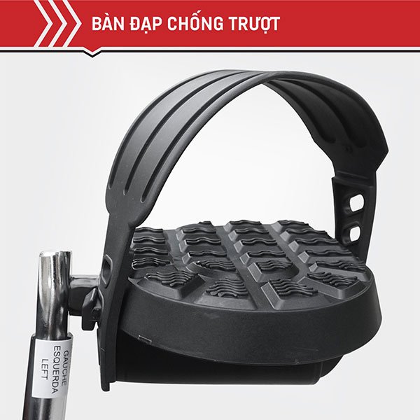 • Bàn đạp được thiết kế chắc chắn, dễ dàng tháo lắp và có độ ma sát cao, có đai cao su ôm lấy bàn chân giúp tăng độ an toàn cho người sử dụng.