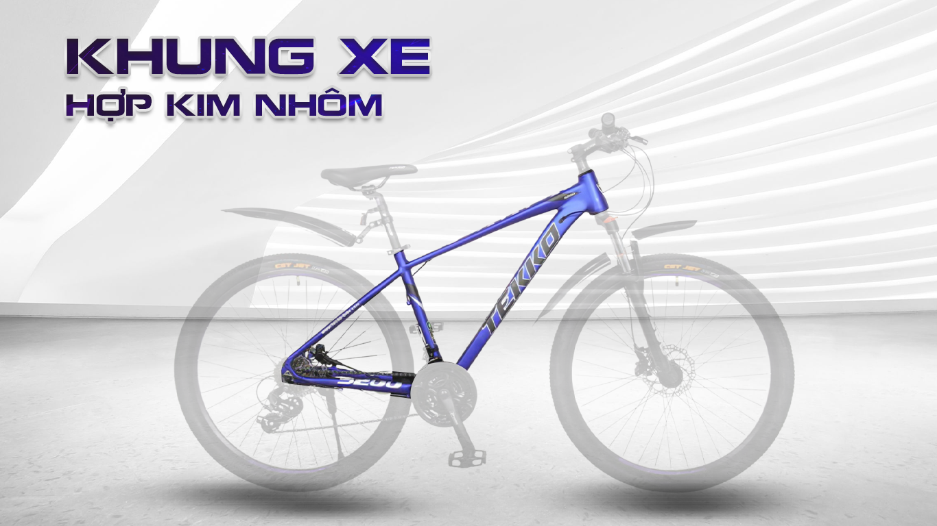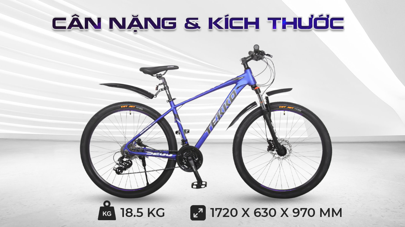 Thông số kĩ thuật: Kích thước bánh xe: Lốp 27.5inch I Hợp kim nhôm 2 lớp Khung sườn: Hợp kim nhôm nước sơn tĩnh điện Phụ kiện: Phanh đĩa - Yên da - Bàn đạp nhựa Ghi đông : tay lái thẳng - hợp kim nhôm Cân nặng : 18.5kg Kích thước : 1720 x 630 x 970 mm Tekko sành điệu, mẫu xe sẽ là lựa chọn tuyệt vời dành cho các bạn trẻ có mong muốn leo núi, đạp xe rèn luyện sức khỏe, đam mê vượt thử thách.