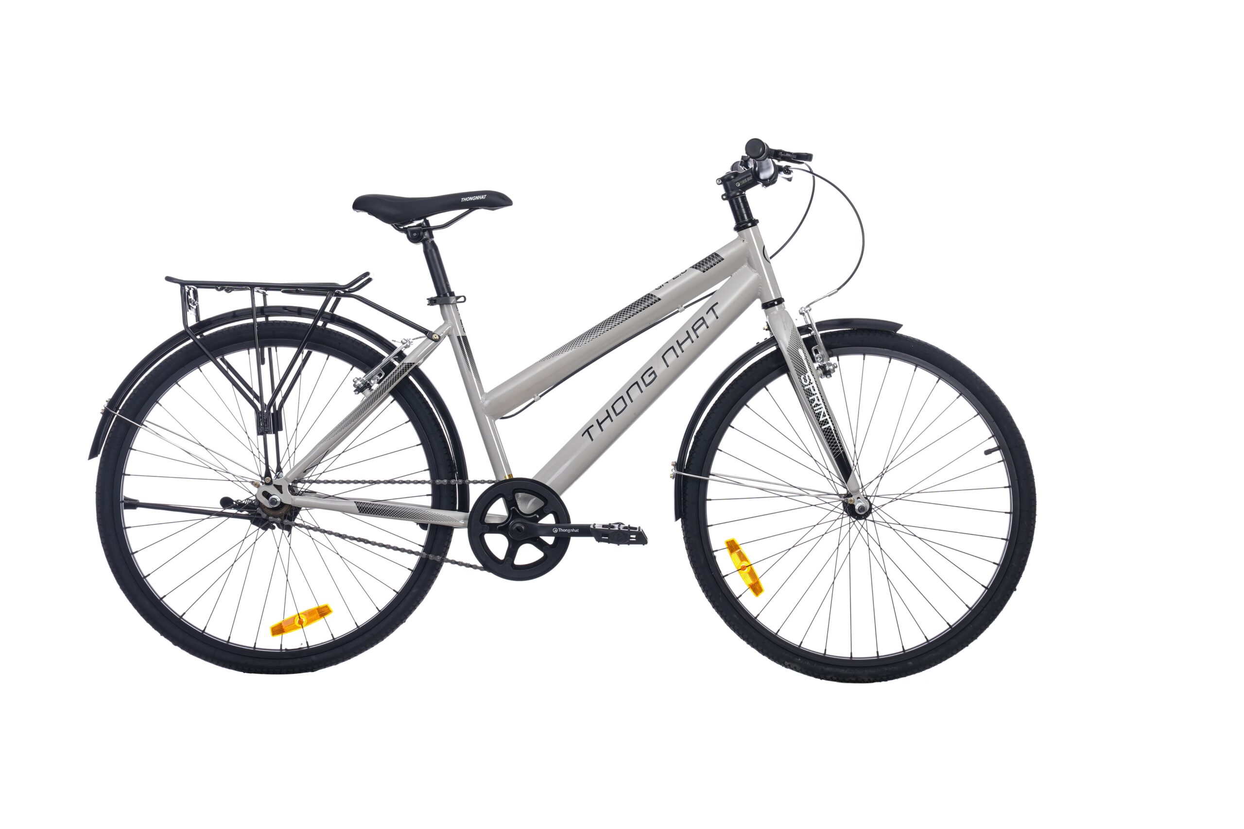- Thiết kế tối giản, gọn đẹp Xe đạp đường phố thể thao Thống Nhất GN06-26 2.0 có kiểu dáng hiện đại, đường nét tinh tế, tông màu ghi, đen và cam mang đến cho bạn nhiều màu sắc để lựa chọn phù hợp với sở thích của mình. Mẫu xe đạp này ứng dụng công nghệ sơn tĩnh điện giúp duy trì tính thẩm mỹ cao, cho khả năng chống chịu tốt trước các điều kiện môi trường khác nhau. Đáp ứng nhu cầu chơi thể thao, làm phương tiện đi học, đi làm thường ngày của trẻ em và người lớn có chiều cao trung bình khoảng 135 cm - 147 cm. Sườn thép gia công chắc chắn Với khung bằng thép có độ bền cao, giữ cấu trúc xe vững chãi, cho khả năng chịu tải trọng toàn xe lên tới 110 kg. Thiết kế dây phanh được đặt dọc theo sườn xe một cách gọn gàng giúp xe đạp đường phố Thống Nhất trông đẹp mắt và hỗ trợ cho việc bảo dưỡng thuận tiện hơn. Chuyển hướng xe linh hoạt với ghi đông ngang Giống như khung sườn, ghi đông cũng được làm từ thép, vật liệu giúp tay lái cứng cáp kết hợp thiết kế ngang đơn giản giúp bạn kiểm soát hướng đi, lái xe dễ dàng. Bộ phận tay nắm được gắn chặt vào ghi đông, chế tạo cho độ bám cao để bạn nắm ổn định, không sợ trượt tay trong khi lái xe đạp đường phố Hệ thống phanh nhạy bén, sử dụng an toàn Tích hợp phanh vành trước và sau cho phản hồi nhanh mỗi khi bạn thắng xe, nhờ đó giúp đảm bảo cho người lái xe an toàn mỗi khi cần dừng xe lại hoặc xử lý tình huống khẩn cấp. Ngoài ra, với kết cấu đơn giản, hệ thống phanh dễ thay mới và bảo trì, giúp tiết kiệm chi phí và thời gian cho bạn tối đa. Phuộc cứng hạn chế rung lắc Mẫu xe đạp Thống Nhất này được trang bị phuộc trước bằng thép rắn chắc giúp giữ cho xe di chuyển ổn định từ mặt đường phẳng cho đến những đoạn đường gồ ghề, khó di chuyển. Yên xe mềm mịn, ngồi thoải mái mọi lúc Chất liệu da cho yên xe ngồi êm ái trong suốt thời gian bạn lái xe, dễ dàng lau chùi khi bám bẩn. Yên phụ cứng cáp, chịu lực tốt, đáp ứng tải trọng 30 kg cho bạn chở hàng hóa hoặc người tiện lợi. Di chuyển mượt mà với bánh xe 26 inch Cả hai bánh xe đều có kích thước 24 inch phù hợp với cấu trúc của toàn bộ xe khi bạn lái nhanh hay chậm đều hoạt động ổn định, nhịp nhàng. Bộ phận lốp xe 24"x1 3/8 sử dụng bền, trên bề mặt có nhiều rãnh giúp tăng tính ma sát cho quá trình lái xe thêm vững vàng. Vành xe bằng hợp kim nhôm có tính chống oxy hóa, chống ăn mòn tốt, khối lượng nhẹ nên cho tổng thể xe nhẹ hơn, di chuyển dễ dàng hơn khi đi qua những địa hình khó khăn. Tiện ích đi kèm Sử dụng đèn phản quang giúp phản chiếu ánh sáng, bảo vệ người dùng tốt hơn khi đi qua những đoạn đường khuất trong bóng tối. Có chân chống thiết kế ở vùng bánh xe sau giúp cho xe tự đứng vững, không bị nghiêng, ngã mà không cần bất kỳ điểm tựa nào. Thông tin chung