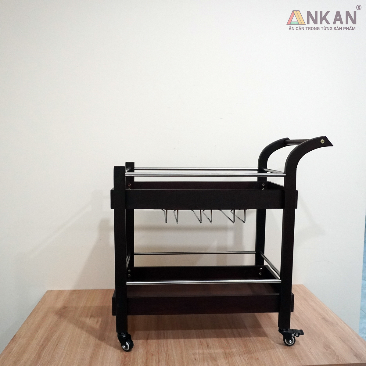Xe đẩy rượu, nước uống, phục vụ tráng miệng, thức ăn, nước uống nhà hàng sang trọng Thương hiệu ANKAN đã bắt đầu mở bán từ hôm nay. Sản phẩm được sản xuất theo tiêu chuẩn và đơn đặt hàng của khách hàng quốc tế.      Xe đẩy rượu được sản xuất bằng gỗ tràm bông vàng loại tốt hơn 10 năm tuổi và Inox không gỉ cho sản phẩm hoàn toàn bền đẹp theo thời gian.  Xe đẩy rượu sử dụng bánh xe PVC loại cao cấp nhất cho phép xe đẩy nhẹ nhàng, không gây tiếng ồn. Hơn thế nữa bánh xe còn được trang bị khóa để giúp xe cố định 1 chỗ. Thông Tin Chi Tiết Xe Đẩy Rượu  Chất liệu: Inox, gỗ tràm bông vàng.  Màu sắc: Vàng Walnut.  Kích trước: Dài 60 x Rộng 35 x Cao 70cm Trọng lượng: 7kg    Đặc Điểm Sản Phẩm  Xe đẩy được thiết kế 2 ngăn   Có tay cầm thuận lợi cho người sử dụng dễ dàng di chuyển.  Bánh xe bọc cao su, giảm tiếng ồn tối đa   Thường dùng trong nhà hàng, khách sạn khu du lịch resort,