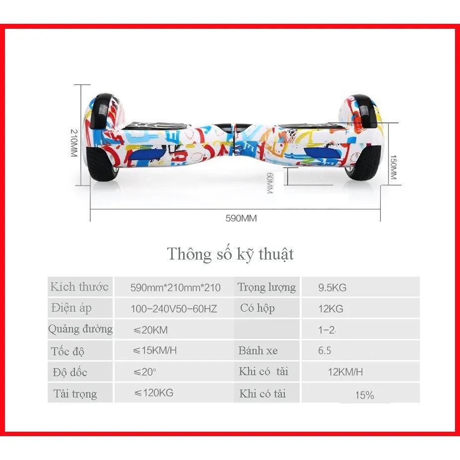 - Kích thước lốp: 6.5 inch lốp cao su đặc Tính năng tự cân bằng cực an toàn Tay xách tiện lợi giúp mang du lịch dễ dàng Loa Bluetooth Phát nhạc gắn trong xe 6 ĐÈN: 2 LED trên bánh, 2 LED soi đường, 2 LED ở bánh Bộ sản phẩm gồm: