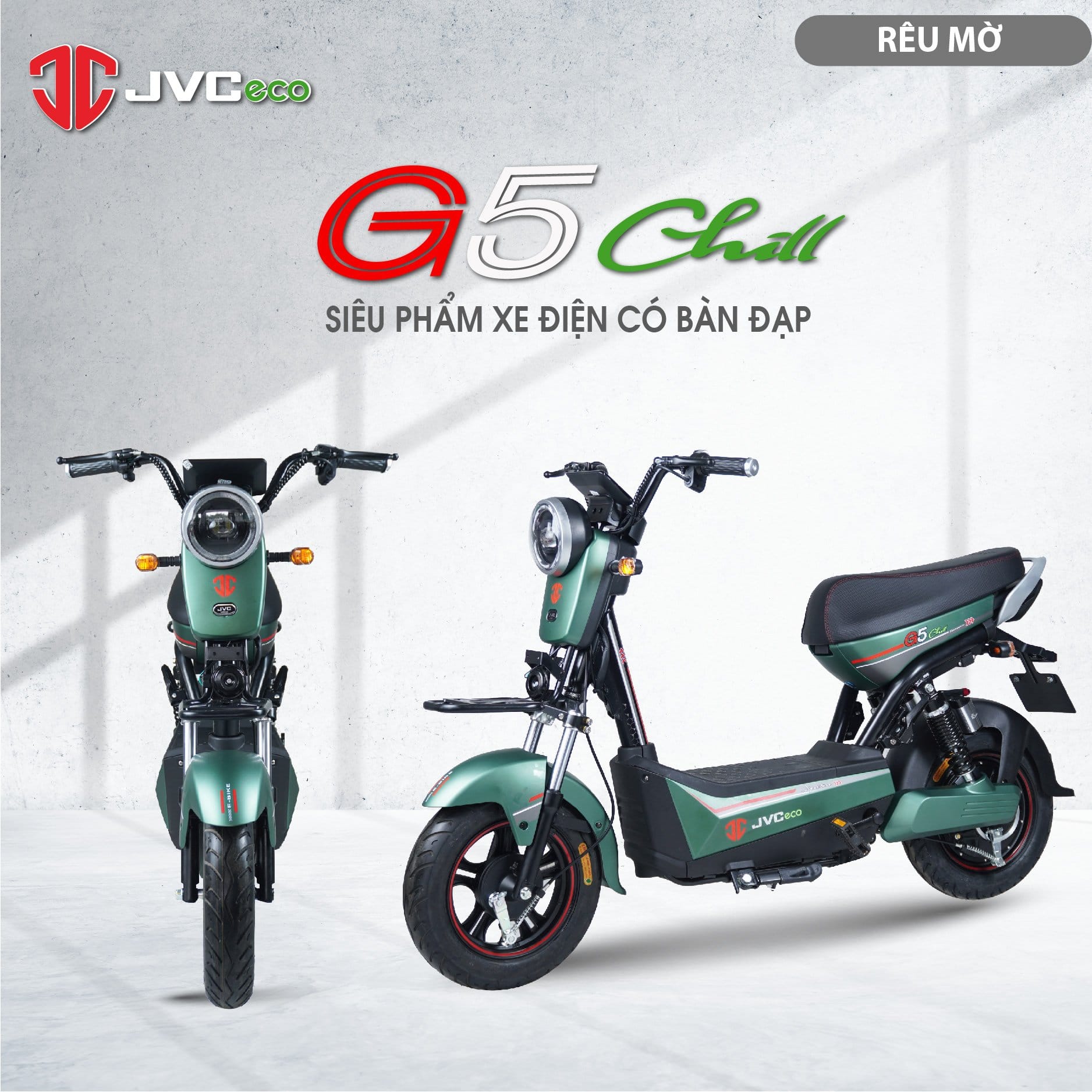 JVC G5 CHILL XE ĐIỆN CÓ BÀN ĐẠP ️ JVC G5 CHILL được thiết kế theo phong cách HIỆN ĐẠI, TINH TẾ mang tới sự tự tin cho người lái ƯU ĐIỂM NỔI BẬT CỦA JVC G5 CHILL Bàn đạp trợ lực hỗ trợ hành trình di chuyển Bộ tem mới thiết kế THỜI TRANG Đèn pha dạng tròn góc sáng rộng hơn Tay ga, công tắc, tay phanh cao cấp đến từ thương hiệu Wuxing Đồng hồ dẹt hiển thị thông minh Yên xe êm ái in dấu ấn logo JVC Động cơ mới kết hợp với bộ điều khiển không dây Ắc quy được bổ sung thanh giằng bình chắc chắn tuyệt đối, tháo lắp dễ dàng hơn Vành trước nhập khẩu có thiết kế riêng biệt đồng bộ với động cơ Giam xóc sau nâng cấp chất lượng, bảo hành 12 tháng Động cơ và khung xe bảo hành 36 tháng Bình ắc quy bảo hành 18 tháng