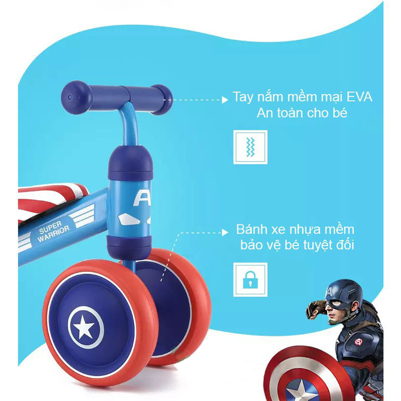 - Với 3 màu có sẵn, bố mẹ có thể dễ dàng lựa chọn phù hợp với sở thích, tính cách của con: Màu xanh kết hợp đỏ dành cho bé trai thích đội trưởng Mỹ Bản Lĩnh (Captain America) Màu vàng tinh nghịch khỏe khoắn cho bé. Màu hồng nữ tính đáng yêu cho bé gái. Chất liệu an toàn, thiết kế ngộ nghĩnh: – có thiết kế khung xe bằng kim loại không gỉ bền chắc theo thời gian sử dụng. Bề mặt xe nhẵn mịn, sơn phủ không độc hại với các góc cạnh bo tròn không sắc nhọn, không làm ảnh hưởng đến sức khỏe của trẻ. – Bánh xe được chế tạo từ nhựa đúc an toàn, cứng cáp với độ chịu lực cao, làm tăng thêm độ chắc chắn cho kết cấu xe. – Bánh xe và tay cầm bọc đệm mềm mại, êm ái, bảo vệ sức khỏe và tạo sự thoải mái khi bé lái xe. – Xe chòi chân Duke nổi bật với các màu sắc dễ thương, điệu đà và hình ảnh chú vịt ngộ nghĩnh, màu xanh sọc cờ, in trên trục lái và yên xe, chắc chắn sẽ khiến bé vô cùng thích thú khi vui chơi. Di chuyển an toàn, thoải mái: – có thiết kế ghế ngồi dài bọc đệm mềm mại mang lại cho bé cảm giác thoải mái và dễ chịu mỗi khi vui chơi. – Tay cầm vừa vặn, bọc lớp êm ái chống trơn trượt, được thiết kế nằm ngang, tương thích với chiều cao yên giúp bé điều khiển chuyển hướng xe rất dễ dàng, từ đó tăng khả năng vận động và phản xạ linh hoạt của trẻ nhỏ. – Xe chòi chân kết cấu 4 bánh hoạt động trơn tru, đặc biệt chắc chắn hơn với bánh đúp phía sau. Vành bánh xe được làm từ nhựa đúc, lốp xe đặc, mềm, chống bị đâm thủng bởi các chướng ngại vật trên đường đi. Tăng khả năng vận động của bé: – Xe chòi chân là giải pháp tốt giúp bé phát triển khả năng vận động ngay từ những năm tháng đầu đời. Thông qua động tác đẩy chân, sự điều hướng của đôi tay bé không chỉ được hỗ trợ phát triển thể lực, sự dẻo dai của hệ xương khớp mà còn rèn luyện cho bản thân khả năng nhanh nhạy, nhạy bén, từ đó tác động tích cực tới sự phát triển của tư duy và não bộ sau này. – Với Xe chòi chân – Tập cân bằng 4 bánh cao cấp, giờ đây bé cùng bạn bè có thể cùng nhau tạo nên một cuộc đua gay cấn để có được những giờ phút vui chơi vận động thật thư giãn và sảng khoái. Thông tin kích thước: – Kích thước xe (D x R x C): 50 x 21 x 35 cm. – Đường kính bánh xe: 15 cm – Chiều cao yên ngồi: 21 cm – Chiều dài tay cầm: 21 cm.