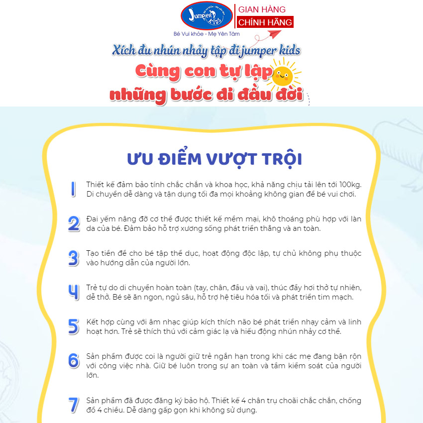 - Xích đu nhún nhảy tập đi Jumper Kids cho bé tha hồ nhún nhảy mà không cần bế bồng, giúp ba mẹ có thêm nhiều thời gian để làm việc khác trong khi con yêu vẫn được vui chơi trong khoảng không gian an toàn.