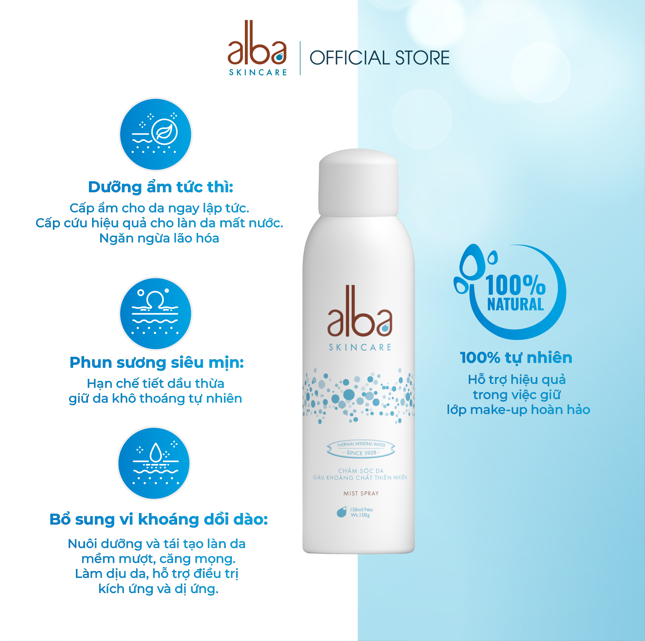 - GIỚI THIỆU SẢN PHẨM Alba Skin Care mang đến dòng xịt khoáng giàu khoáng chất, giúp cấp ẩm tức thì, chống lão hóa và nuôi dưỡng làn da khỏe mạnh. Được chiết xuất từ nguồn nước khoáng nóng Thanh Tân (Thừa Thiên Huế) quý giá, sản phẩm giúp phục hồi và bảo vệ làn da, cấp nước tức thì hạn chế tình trạng da khô ráp do tác động trực tiếp từ môi trường.