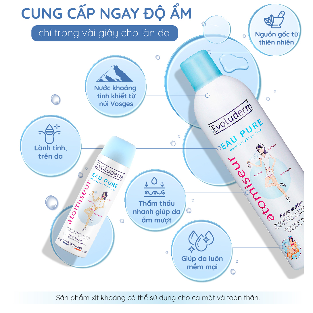 - Xịt khoáng Evoluderm được làm từ nước khoáng tinh khiết, không chứa chất bảo quản và không có hương liệu nhân tạo, an toàn cho mọi loại da, kể cả da nhạy cảm.