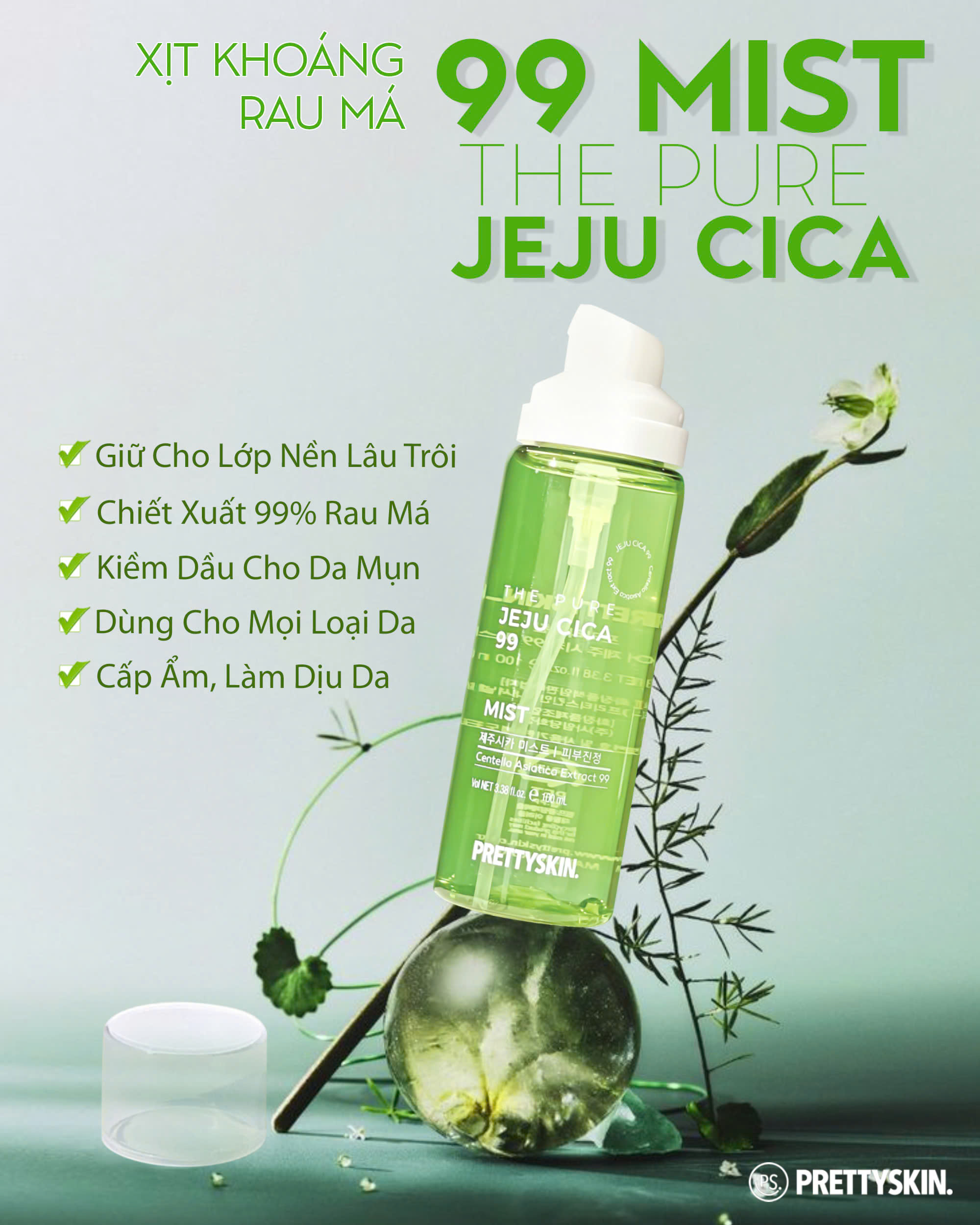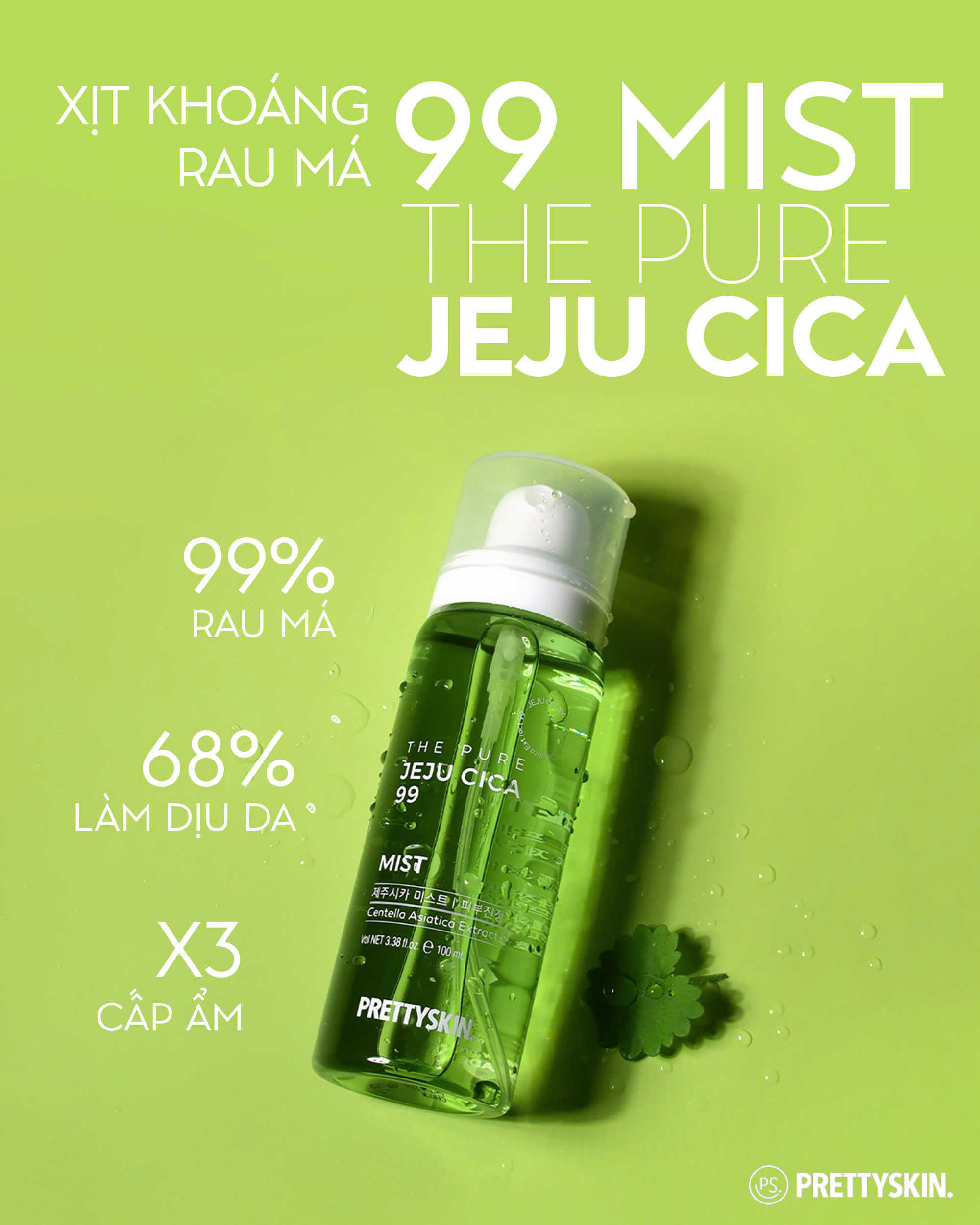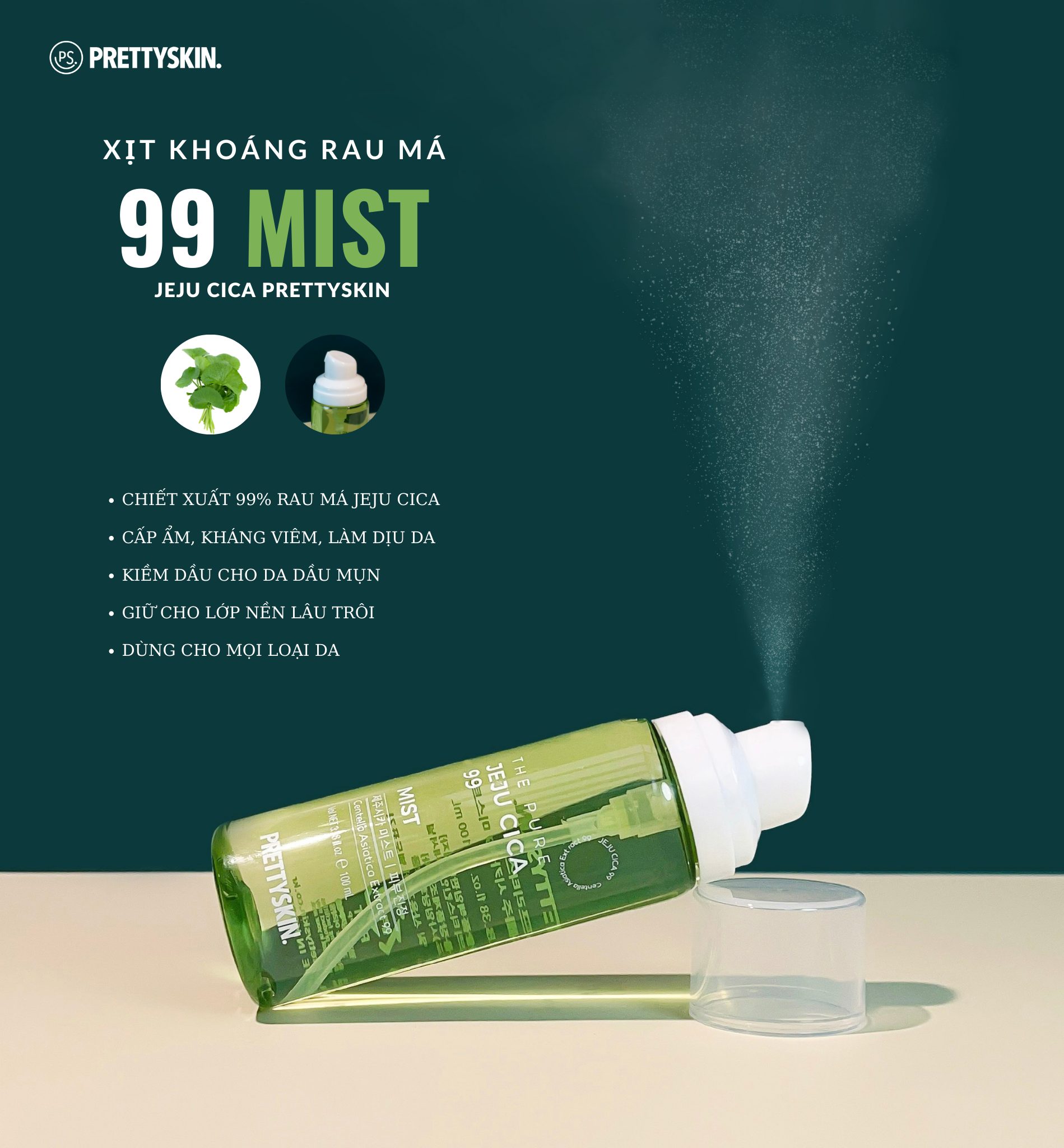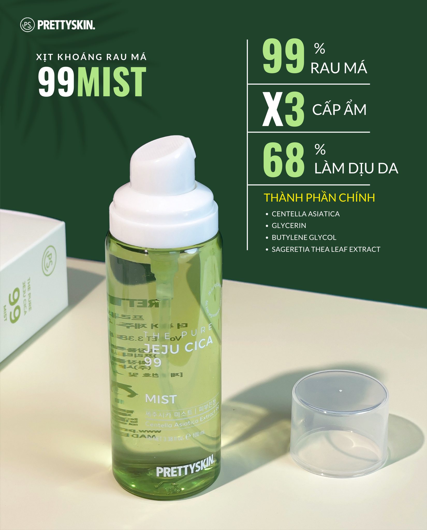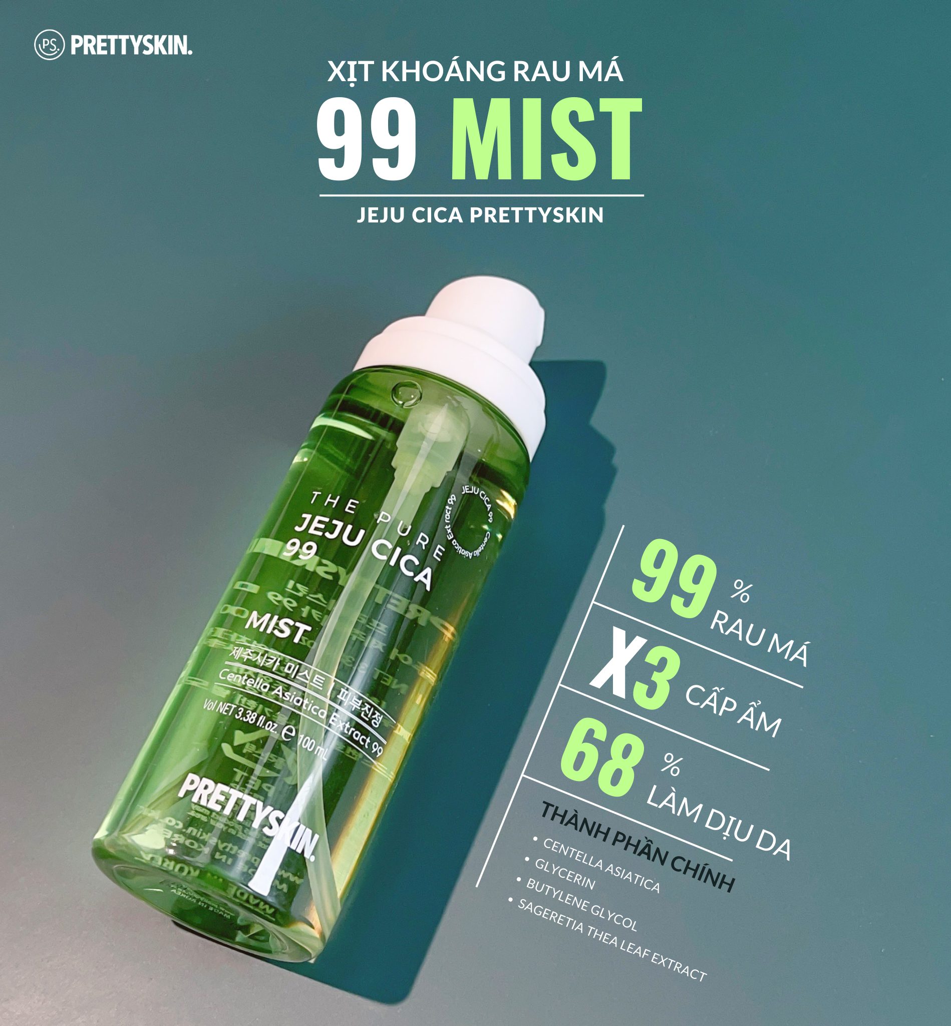 Xịt khoáng rau má Pretty Skin The Pure Jeju Cica 99 Mist làm dịu cấp ẩm cho da Xuất xứ: Hàn Quốc. Thương Hiệu: Prettyskin. Dung tích: 100ml. Phù hợp: Mọi loại da, đặc biệt da dầu, mụn CÔNG DỤNG VÀ THÀNH PHẦN