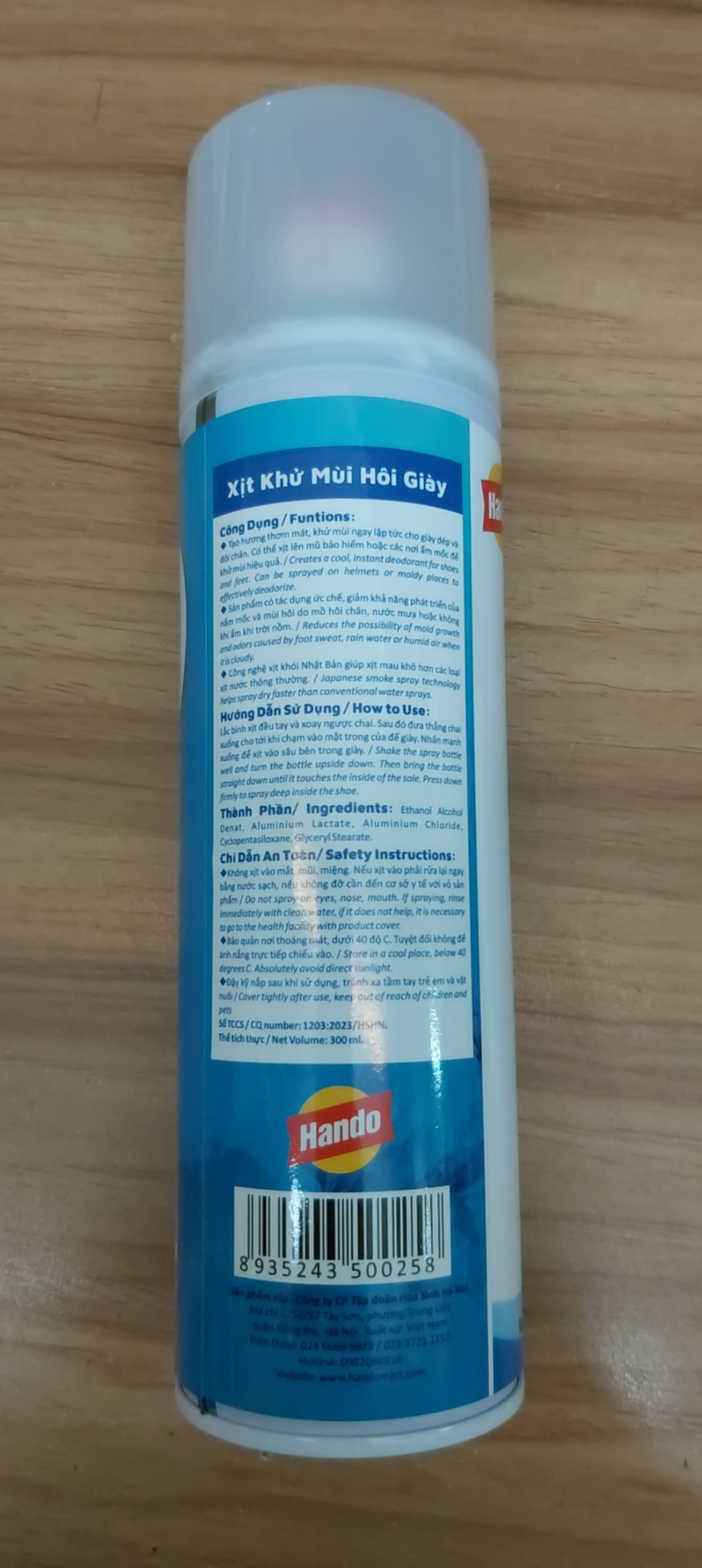 Thông tin sản phẩm Tên sản phẩm : Chai xịt khử mùi giầy, dép, mũ bảo hiểm 120ml Hando Hướng dẫn sử dụng : Xịt vào giày, dép, mũ xe máy trước khi sử