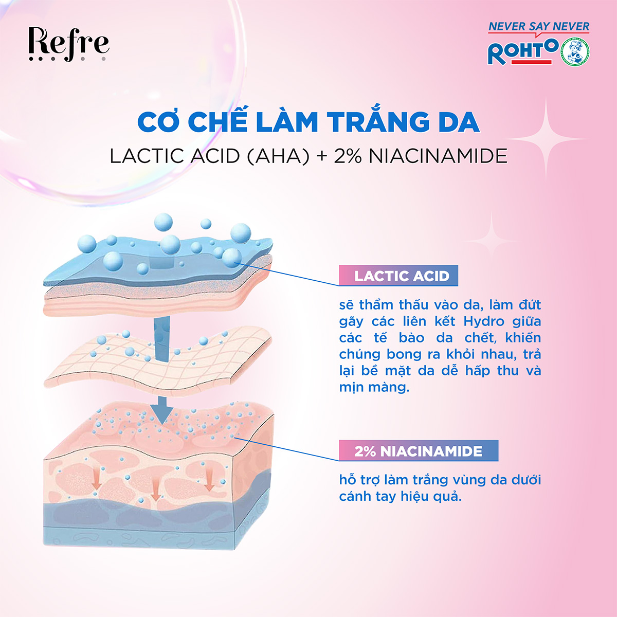 - Đặc tính: Sản phẩm xịt khử mùi đầu tiên tại Việt Nam áp dụng công nghệ mùi hương Lactone giúp khóa mùi tỏa hương thơm tự nhiên, tăng sự tự tin, nữ tính cho mỗi cô gái Xịt khử mùi Refre có công nghệ khóa mùi 24 giờ. Giảm tiết mồ hôi suốt 48 giờ Công thức 5 KHÔNG: KHÔNG CỒN - KHÔNG PARABEN - KHÔNG MUỐI NHÔM - KHÔNG GÂY KÍCH ỨNG - KHÔNG Ố VÀNG ÁO Hỗn hợp AHA cùng Niacinamide hàm lượng cao giúp dưỡng trắng vùng cánh hiệu quả, cho bạn tự tin diện mọi trang phục.
