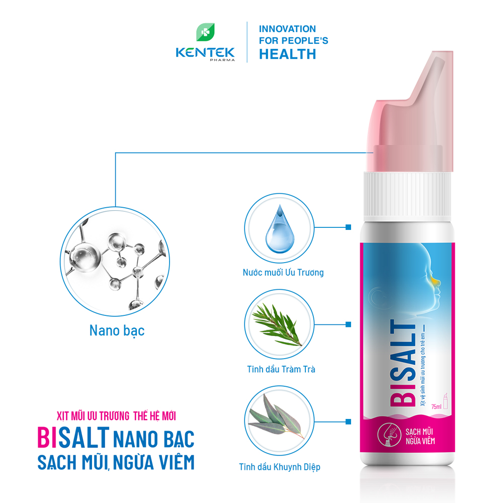̣ ̣̂ ̃ ̛ ̛̛ ̣ ̀ ̉ với vòi xịt phun sương, kèm van một chiều hiện đại giúp đưa dung dịch chứa hàng triệu phân tử nano bạc nhẹ nhàng len lỏi vào từng ngóc ngách khoang mũi, dễ dàng làm sạch niêm mạc, kháng khuẩn đường mũi sau mỗi lần xịt. Được kết hợp thành phần thảo dược được chiết xuất 100% tự nhiên như tràm trà, khuynh diệp nên BISALT có mùi rất thơm lại ấm, cực kỳ an toàn với trẻ nhỏ.