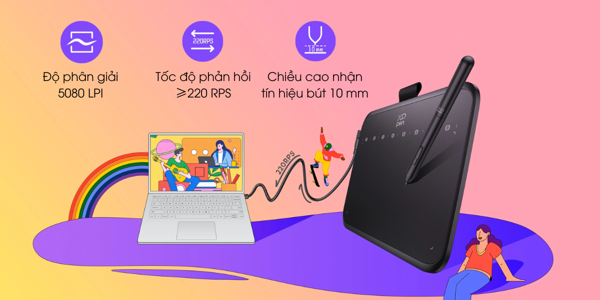 Vùng hoạt động 266.7 x 166.7mm Độ phân giải 5.080lpi (line per inch) Độ phản hồi 266rps Độ cảm ứng 10mm Độ chính xác ±0.3mm Độ nghiêng ±60° nghiêng Lực nhấn bút 8192 mức Phím