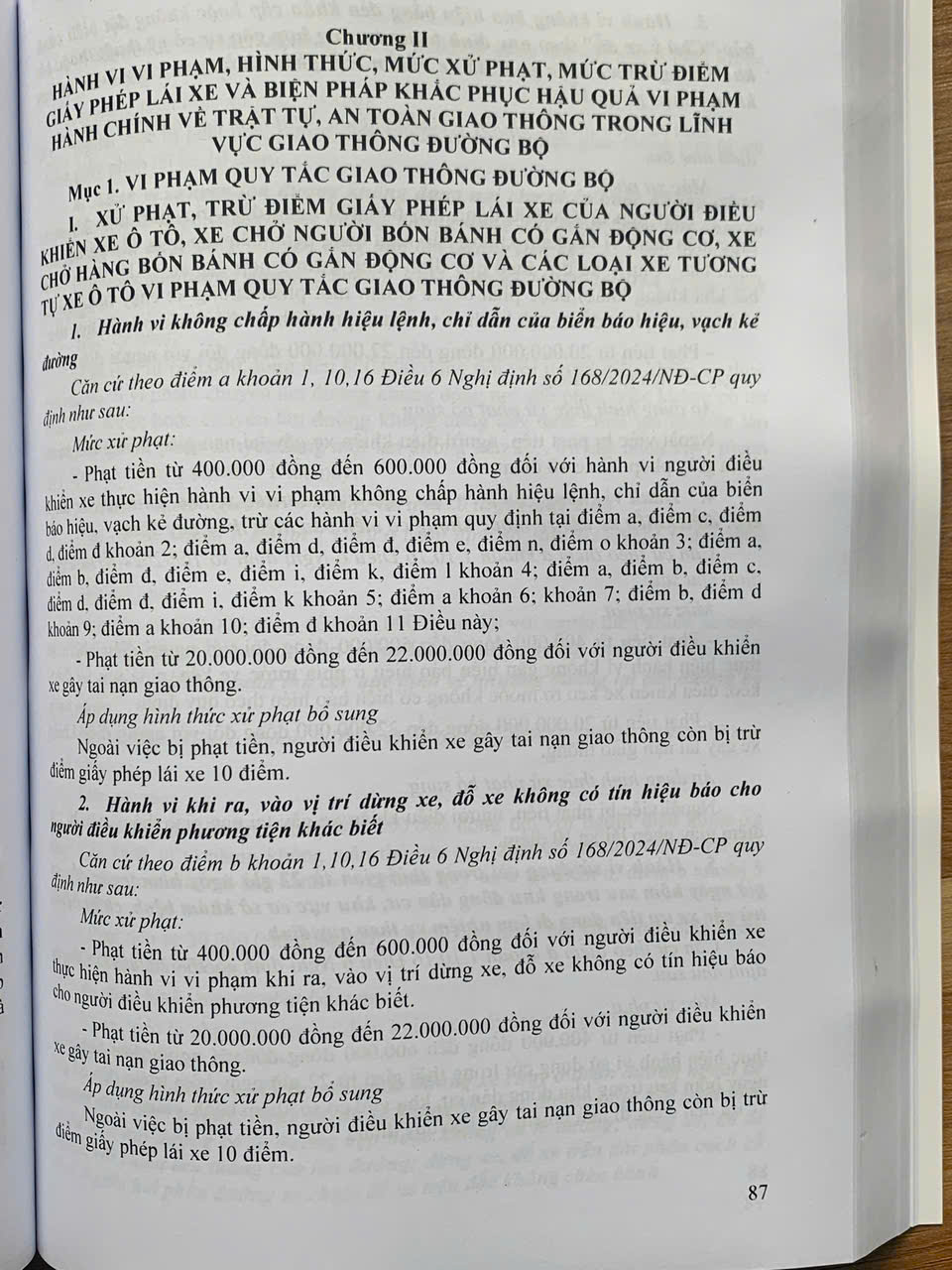 Ngày 26 tháng 12 năm 2024, Chính phủ đã ban hành Nghị định số 168/2024/NĐ-CP của Chính phủ quy định xử phạt vi phạm hành chính về trật tự, an toàn giao thông trong lĩnh vực giao thông đường bộ; trừ điểm, phục hồi điểm giấy phép lái xe. Nghị định quy định xử phạt vi phạm hành chính bao gồm: hành vi vi phạm hành chính; hình thức, mức xử phạt, biện pháp khắc phục hậu quả đối với từng hành vi vi phạm hành chính; mức trừ điểm giấy phép lái xe đối với từng hành vi vi phạm hành chính; trình tự, thủ tục, thẩm quyền trừ điểm, phục hồi điểm giấy phép lái xe để quản lý việc chấp hành pháp luật về trật tự, an toàn giao thông đường bộ của người lái xe. Nhằm tuyên truyền sâu rộng pháp luật về an toàn giao thông, tạo sự chuyển biến mạnh mẽ từ nhận thức đến hành động của người tham gia giao thông Nhà Xuất Bản Hồng Đức xuất bản cuốn sách.